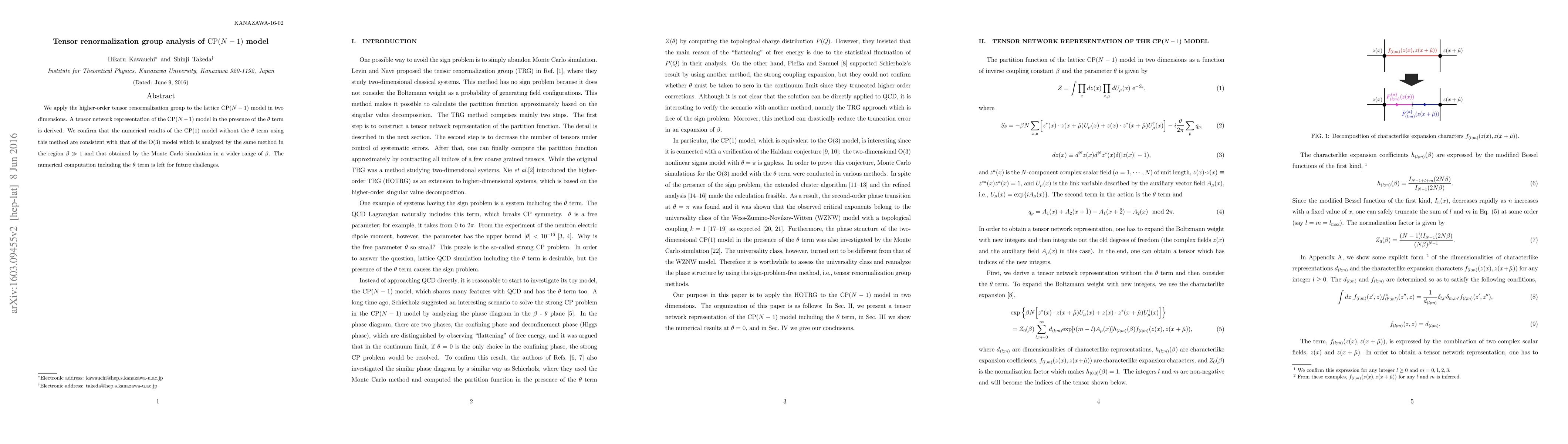 This paper applies the higher-order tensor renormalization group to the 2D CP($N-1$) model, deriving a tensor network representation and confirming consistency with O(3) model results for CP(1) without the $\theta$ term. Future work will explore the $\theta$ term's effects.