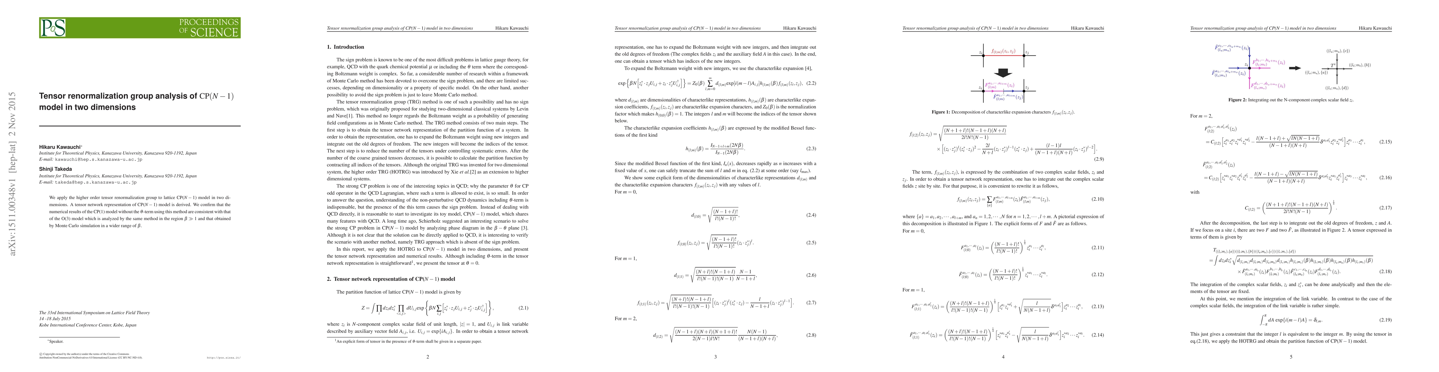 This paper applies tensor renormalization group to the 2D CP($N-1$) model, deriving a tensor network representation. The results for the CP(1) model without the $\theta$-term are consistent with those of the O(3) model and Monte Carlo simulations across various $\beta$ values.
