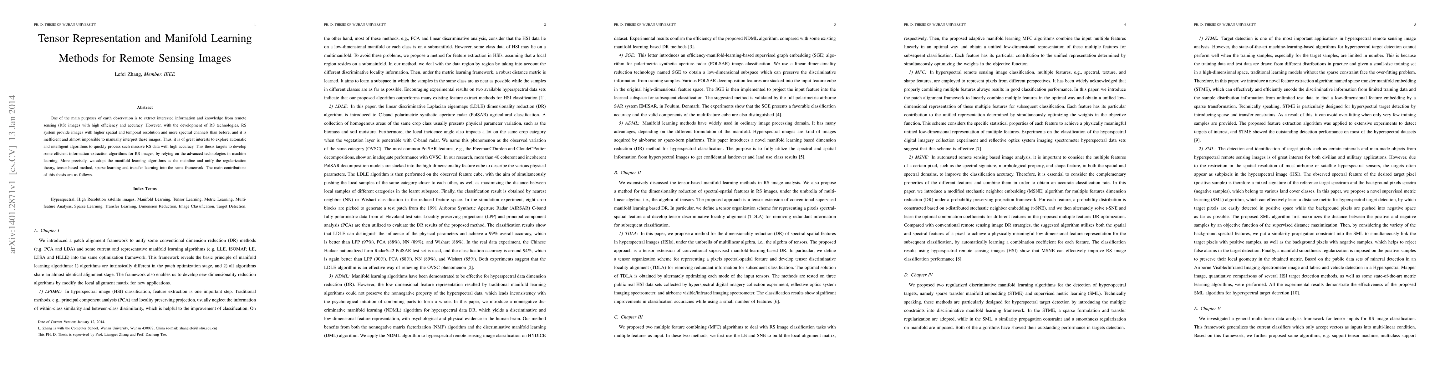This paper develops efficient algorithms for processing high-resolution remote sensing images using manifold learning, tensor representation, regularization, sparse learning, and transfer learning to extract information automatically and accurately. The proposed methods aim to handle the massive data from advanced RS technologies without manual interpretation.