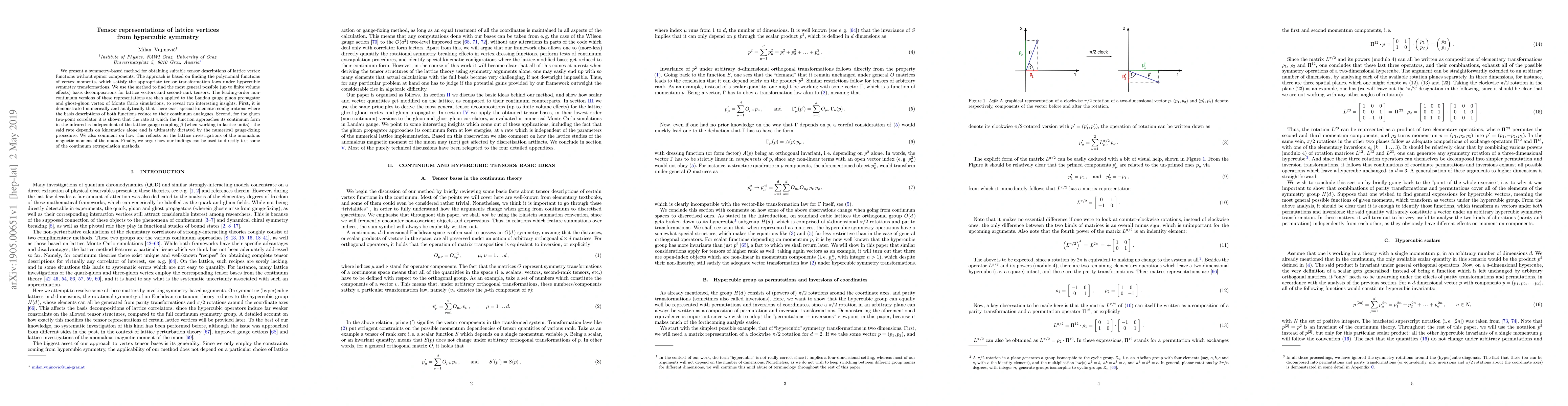 We present a symmetry-based method for obtaining suitable tensor descriptions of lattice vertex functions without spinor components. The approach is based on finding the polynomial functions of vertex momenta, which satisfy the appropriate tensor transformation laws under hypercubic symmetry transformations. We use the method to find the most general possible (up to finite volume effects) basis decompositions for lattice vectors and second-rank tensors. The leading-order non-continuum versions of these representations are then applied to the Landau gauge gluon propagator and ghost-gluon vertex of Monte Carlo simulations, to reveal two interesting insights. First, it is demonstrated numerically and analytically that there exist special kinematic configurations where the basis descriptions of both functions reduce to their continuum analogues. Second, for the gluon two-point correlator it is shown that the rate at which the function approaches its continuum form in the infrared is independent of the lattice gauge coupling $\beta$ (when working in lattice units): the said rate depends on kinematics alone and is ultimately dictated by the numerical gauge-fixing procedure. We also comment on how this reflects on the lattice investigations of the anomalous magnetic moment of the muon. Finally, we argue how our findings can be used to directly test some of the continuum extrapolation methods.