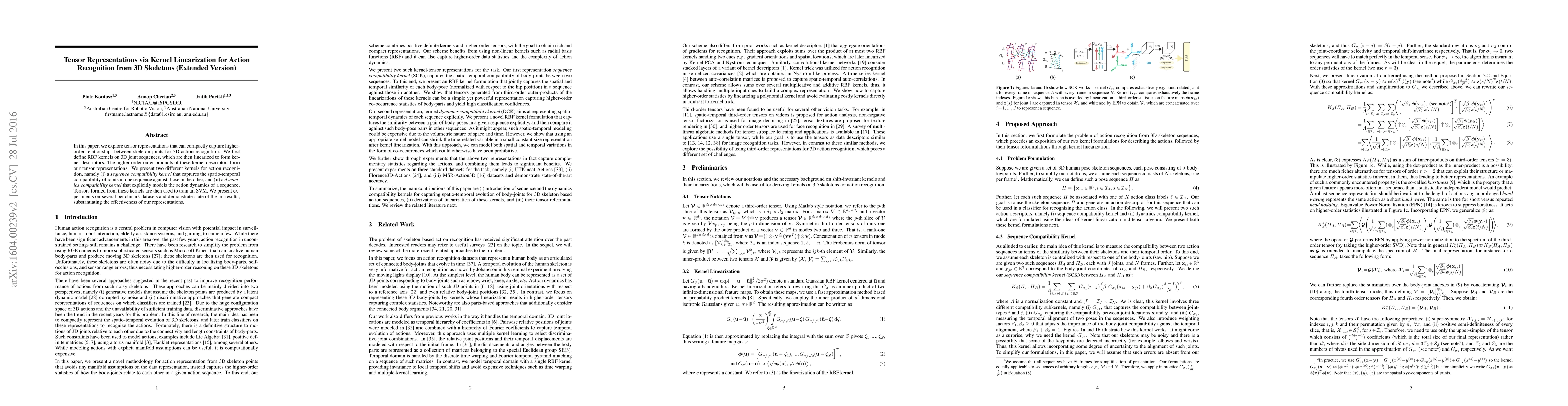 This paper proposes tensor representations via kernel linearization to capture higher-order relationships in 3D skeleton joints for action recognition. It uses RBF kernels on joint sequences, linearizes them to form descriptors, and constructs tensors from their outer-products to train an SVM, achieving state-of-the-art results on benchmark datasets.