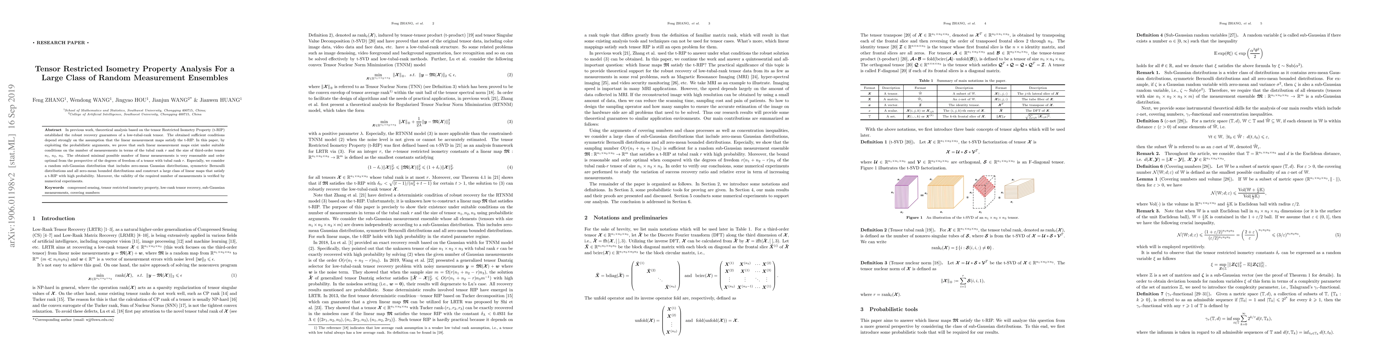 This paper proves that linear measurement maps exist for a large class of random measurement ensembles under suitable conditions on the number of measurements and tensor dimensions, providing robust recovery guarantees with high probability.
