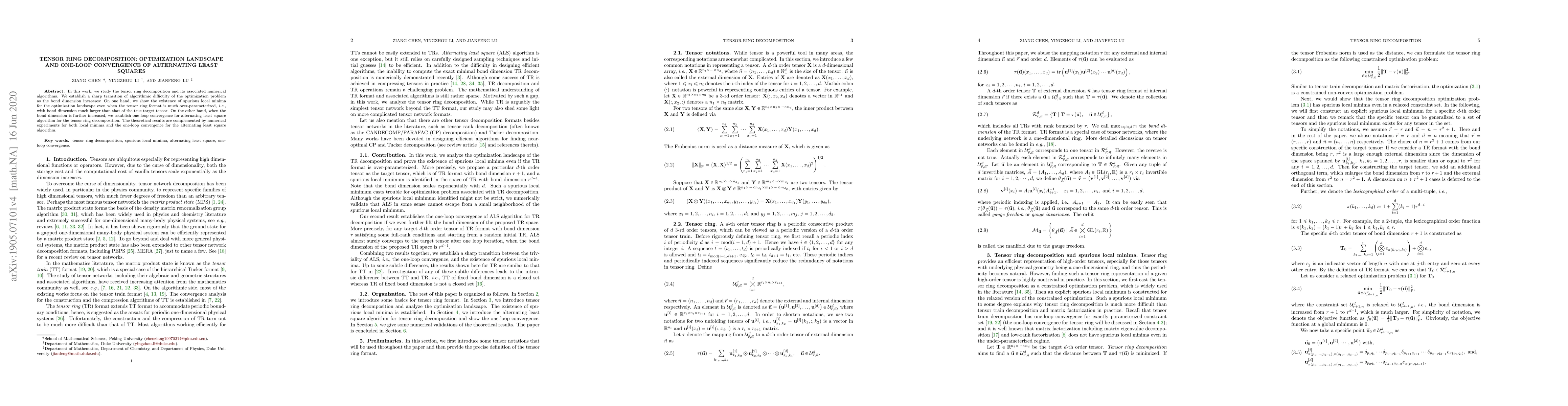 This paper explores tensor ring decomposition and its optimization landscape, demonstrating the emergence of spurious local minima and establishing one-loop convergence for the alternating least squares algorithm as the bond dimension increases. Numerical experiments support the theoretical findings.