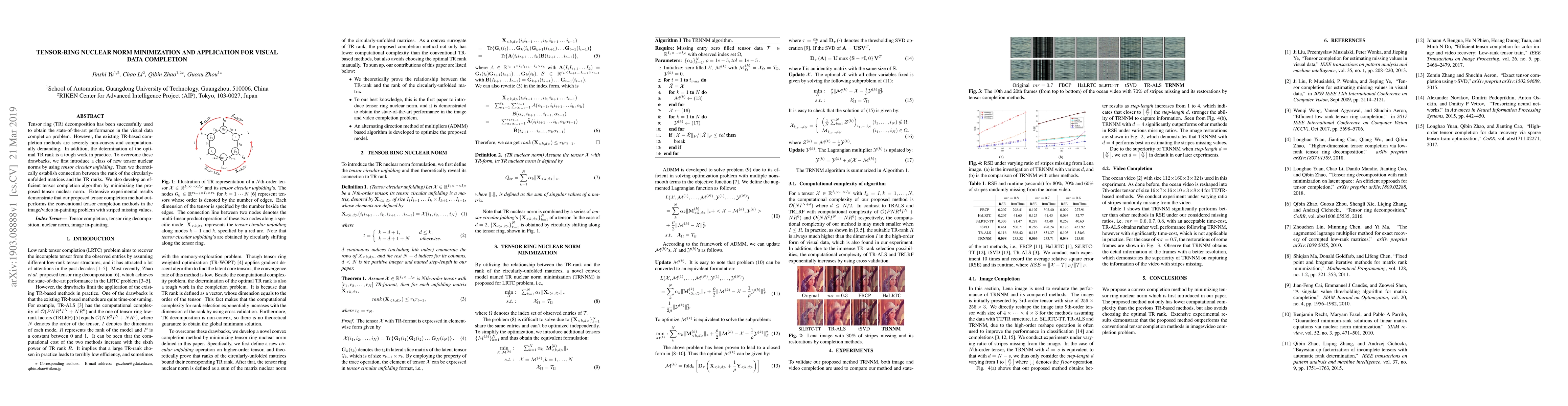 This paper proposes a new tensor nuclear norm for tensor ring decomposition, establishing a theoretical link between circularly-unfolded matrix rank and tensor ring ranks. It introduces an efficient tensor completion algorithm based on this norm, which outperforms existing methods in visual data completion tasks, particularly for images/videos with striped missing values.