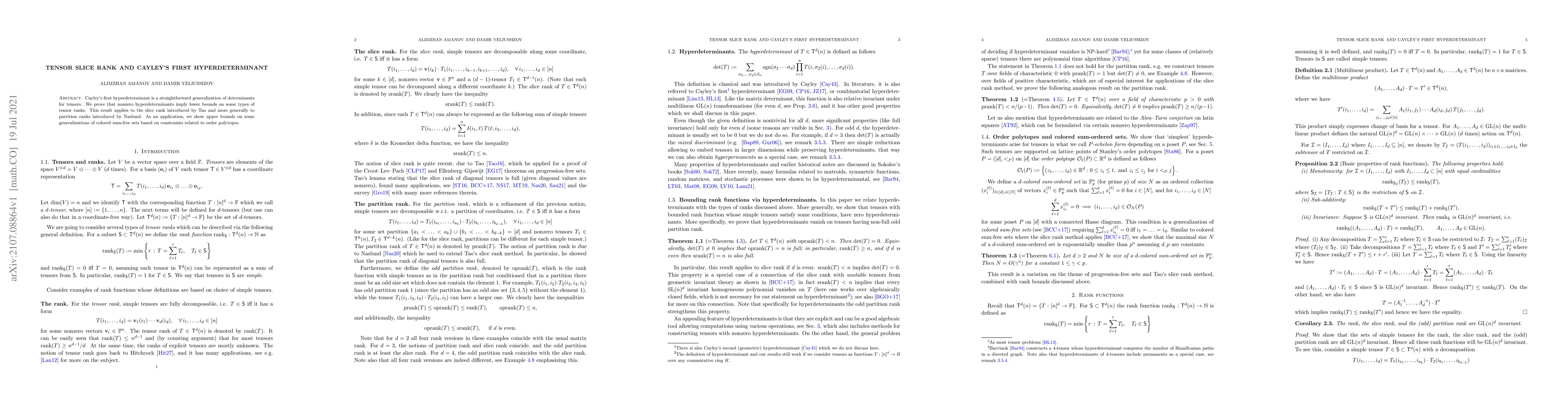 This paper demonstrates that nonzero values of Cayley's first hyperdeterminant provide lower bounds on tensor slice rank and partition ranks. It also uses these results to derive upper bounds on generalized colored sum-free sets related to order polytopes.