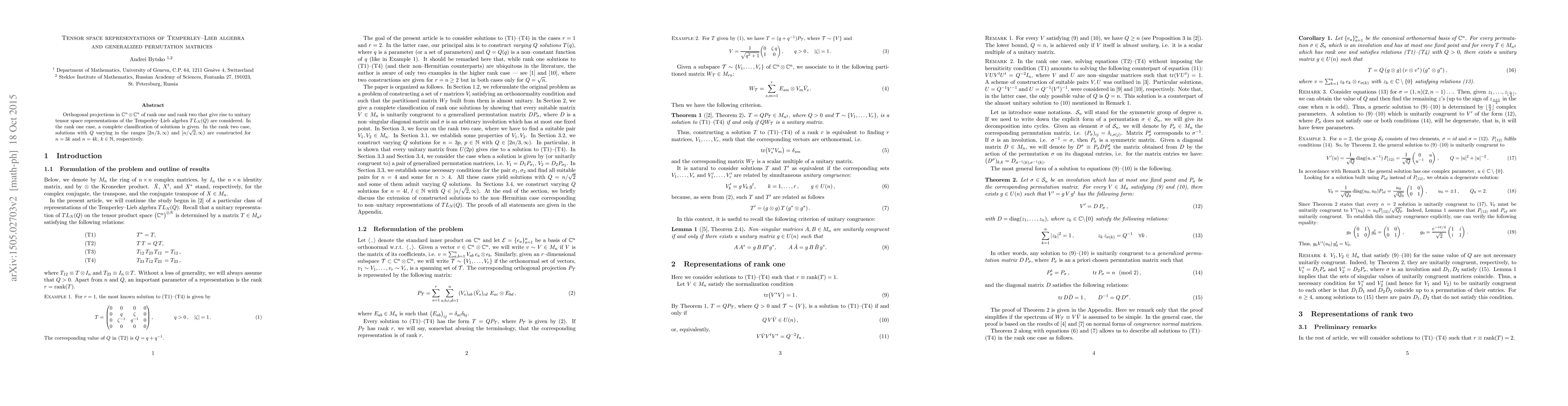 Orthogonal projections in ${\mathbb C}^n \otimes {\mathbb C}^n$ of rank one and rank two that give rise to unitary tensor space representations of the Temperley-Lieb algebra $TL_N(Q)$ are considered. In the rank one case, a complete classification of solutions is given. In the rank two case, solutions with $Q$ varying in the ranges $[2n/3,\infty)$ and $[n/\sqrt{2},\infty)$ are constructed for $n=3k$ and $n=4k$, $k \in {\mathbb N}$, respectively.