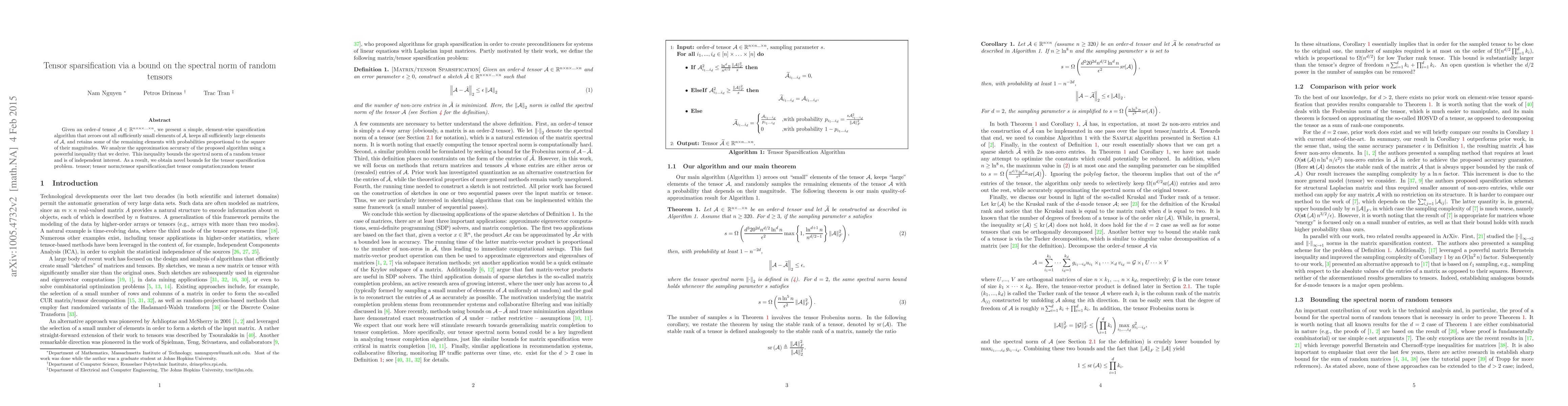This paper proposes an element-wise tensor sparsification algorithm that zeroes out small elements while retaining large ones and some medium-sized elements probabilistically. The authors derive a new inequality to bound the spectral norm of random tensors, providing novel bounds for tensor sparsification.