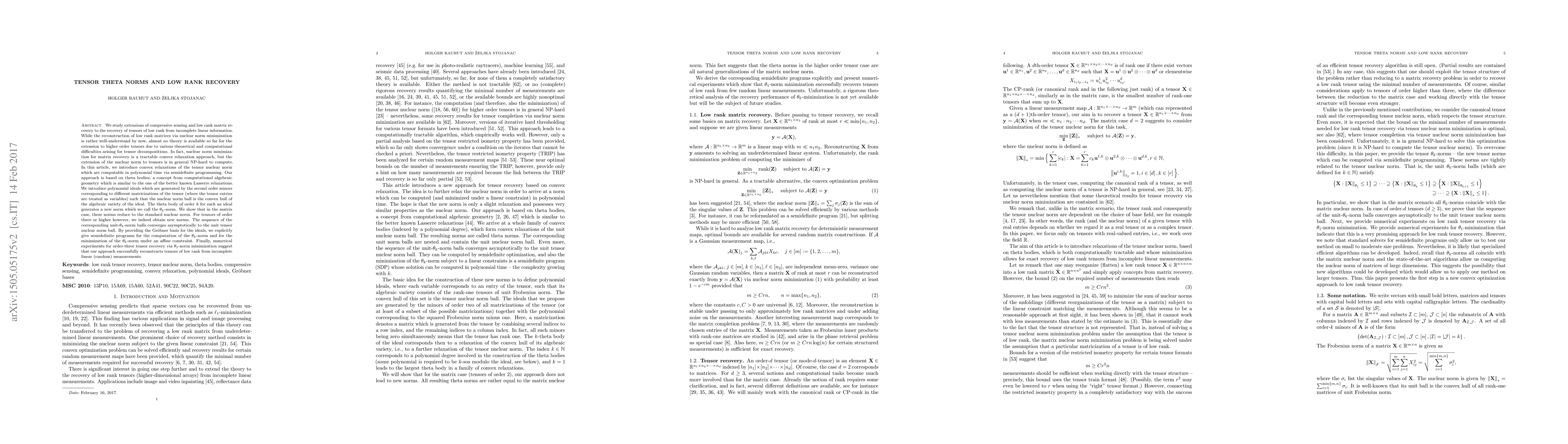 This paper introduces tensor theta norms as a polynomial-time computable convex relaxation for tensor nuclear norm minimization, which addresses the lack of theory for low-rank tensor recovery in compressive sensing. The proposed $\theta_k$-norms, derived from theta bodies, converge asymptotically to the tensor nuclear norm and are shown to effectively reconstruct low-rank tensors from incomplete data.