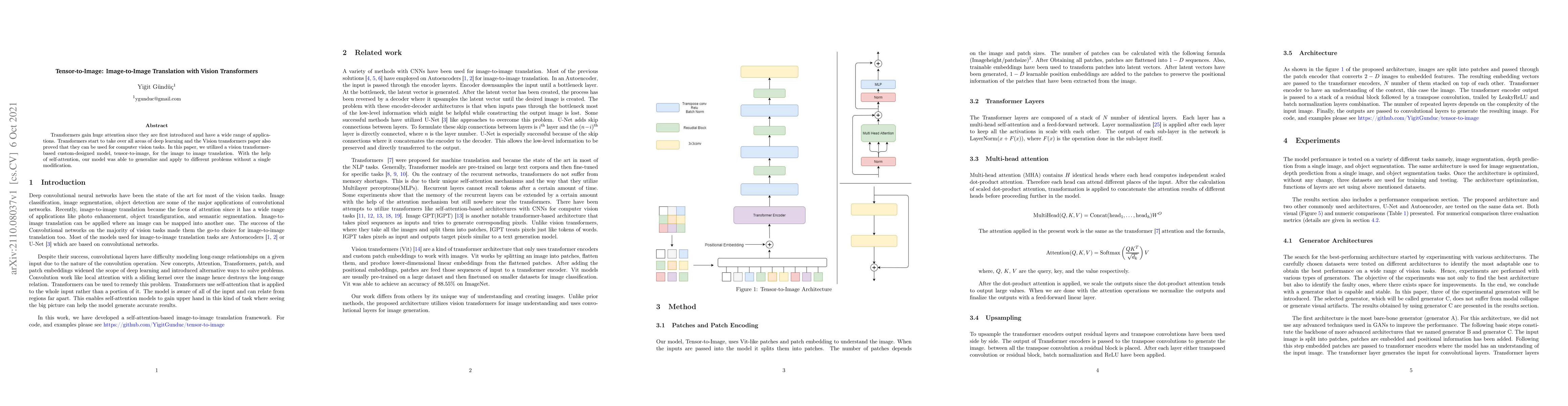 This paper proposes a vision transformer-based model called tensor-to-image for image-to-image translation tasks. The model leverages self-attention to generalize effectively across various problems without requiring modifications.