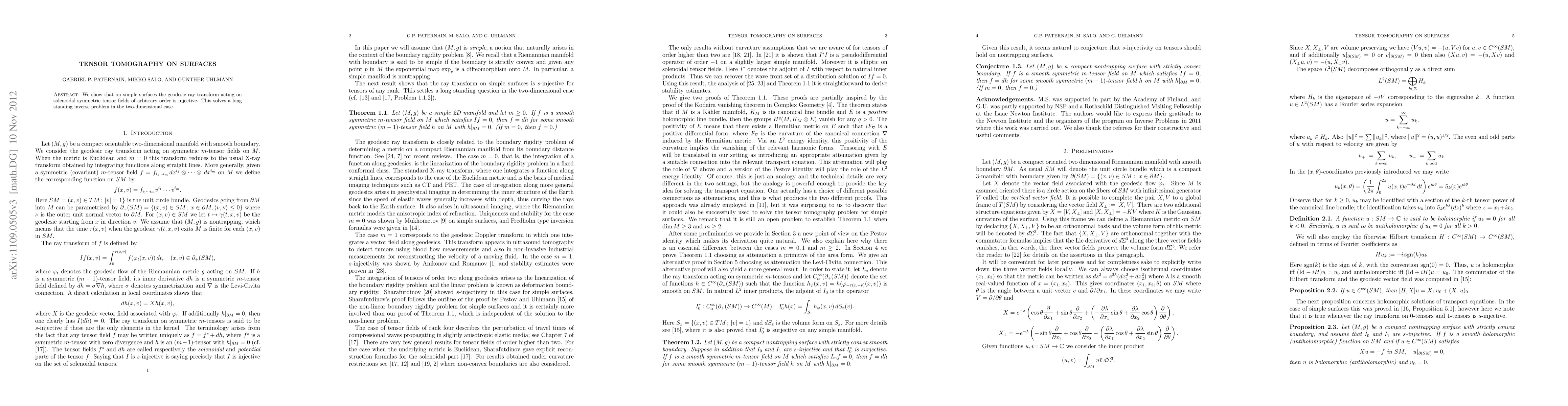 Summary: The paper demonstrates the injectivity of the geodesic ray transform on simple surfaces for solenoidal symmetric tensor fields, resolving a longstanding inverse problem in two dimensions. This breakthrough provides a solution to tensor tomography on surfaces.