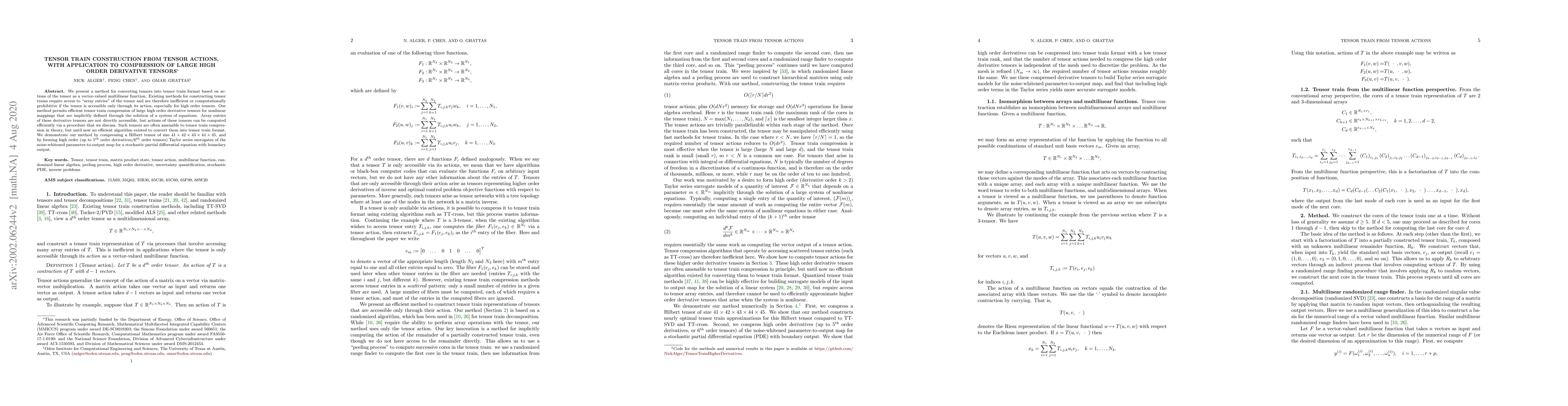This paper presents a novel method for converting tensors into tensor train format based on their vector-valued multilinear function actions, enabling efficient compression of large high order derivative tensors that are only accessible through their actions. The method is demonstrated by compressing a large Hilbert tensor and forming high order Taylor series surrogates for stochastic partial differential equations.