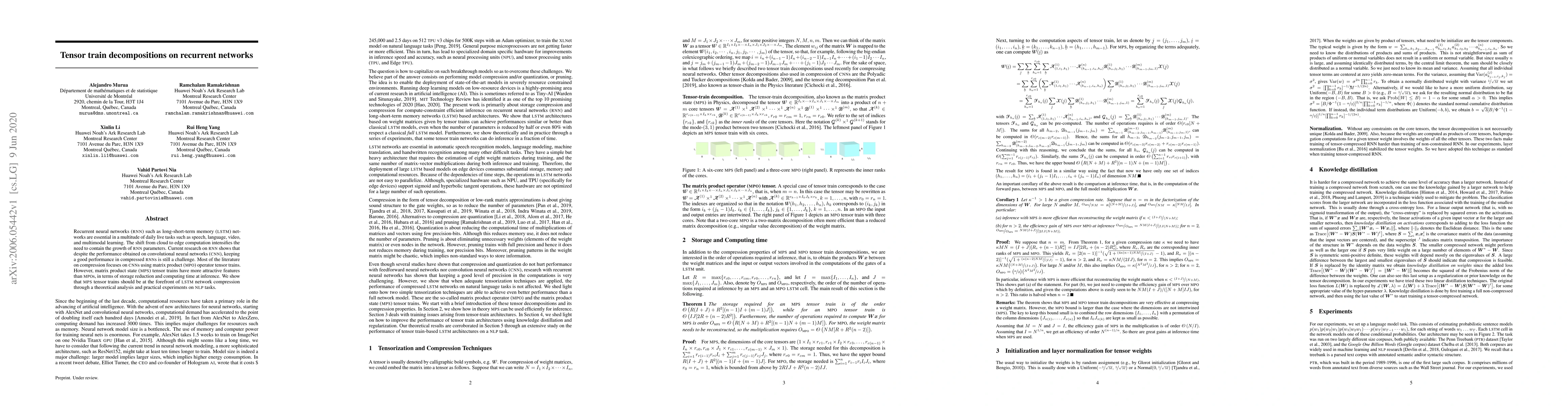 Recurrent neural networks (RNN) such as long-short-term memory (LSTM) networks are essential in a multitude of daily live tasks such as speech, language, video, and multimodal learning. The shift from cloud to edge computation intensifies the need to contain the growth of RNN parameters. Current research on RNN shows that despite the performance obtained on convolutional neural networks (CNN), keeping a good performance in compressed RNNs is still a challenge. Most of the literature on compression focuses on CNNs using matrix product (MPO) operator tensor trains. However, matrix product state (MPS) tensor trains have more attractive features than MPOs, in terms of storage reduction and computing time at inference. We show that MPS tensor trains should be at the forefront of LSTM network compression through a theoretical analysis and practical experiments on NLP task.