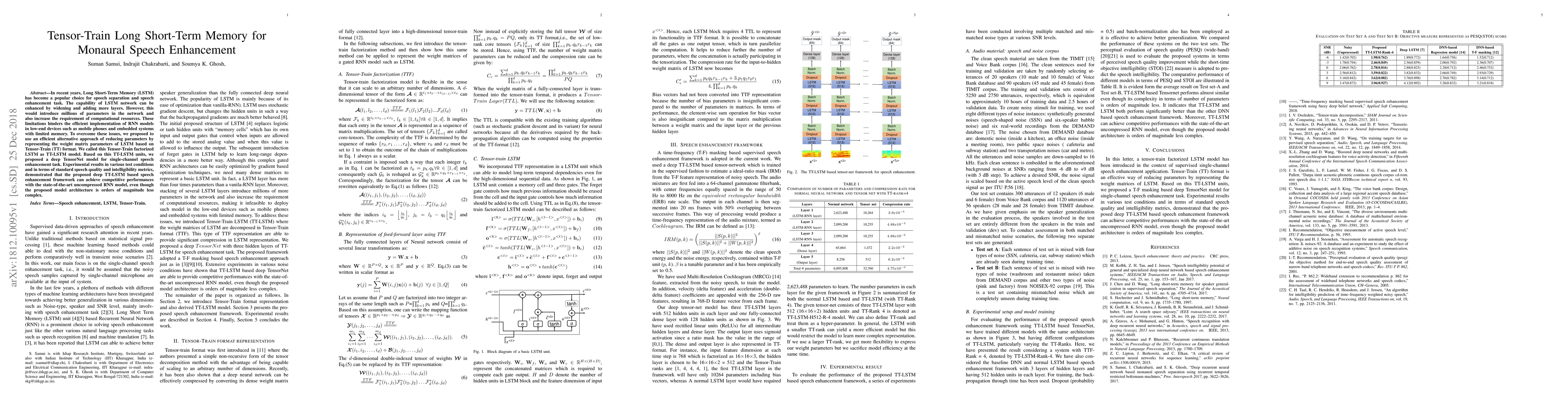 This paper proposes a Tensor-Train factorized LSTM (TT-LSTM) model to enhance monaural speech enhancement while significantly reducing parameters and computational requirements. The deep TensorNet model based on TT-LSTM achieves competitive performance compared to state-of-the-art uncompressed RNN models, despite being much less complex.