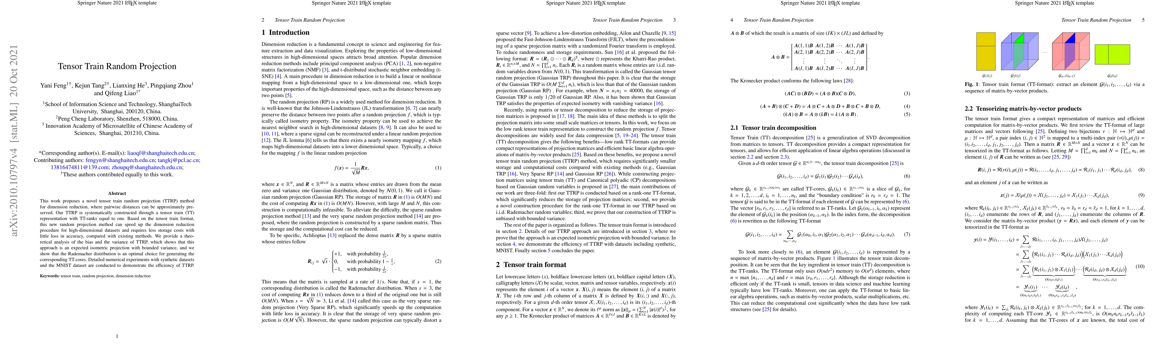 This paper introduces a novel tensor train random projection (TTRP) method for efficient dimension reduction that preserves pairwise distances. The TTRP leverages tensor train representations with TT-ranks of one to reduce computational costs and storage requirements while maintaining accuracy, supported by theoretical analysis and numerical experiments on synthetic and MNIST datasets.