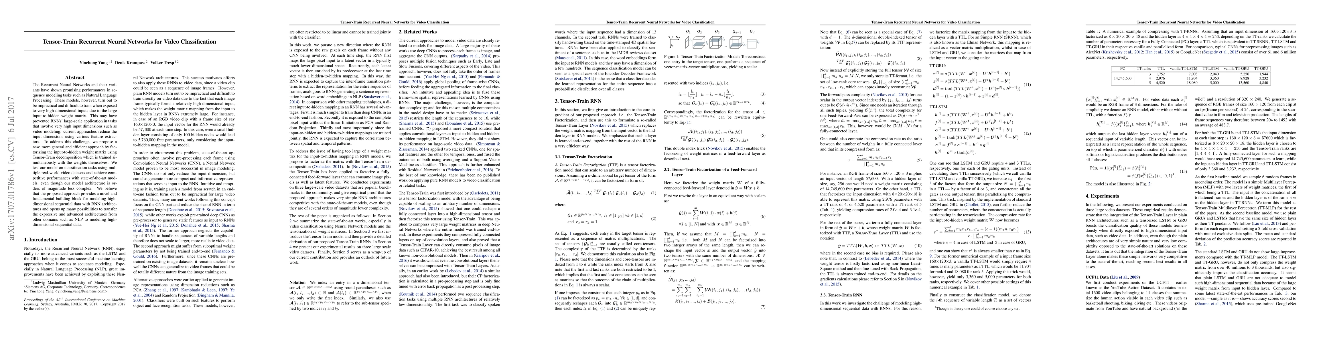 This paper proposes Tensor-Train Recurrent Neural Networks to efficiently model high-dimensional sequential data like video, by factorizing the input-to-hidden weight matrix. The approach achieves competitive performance on video classification tasks while being significantly less complex than state-of-the-art models.