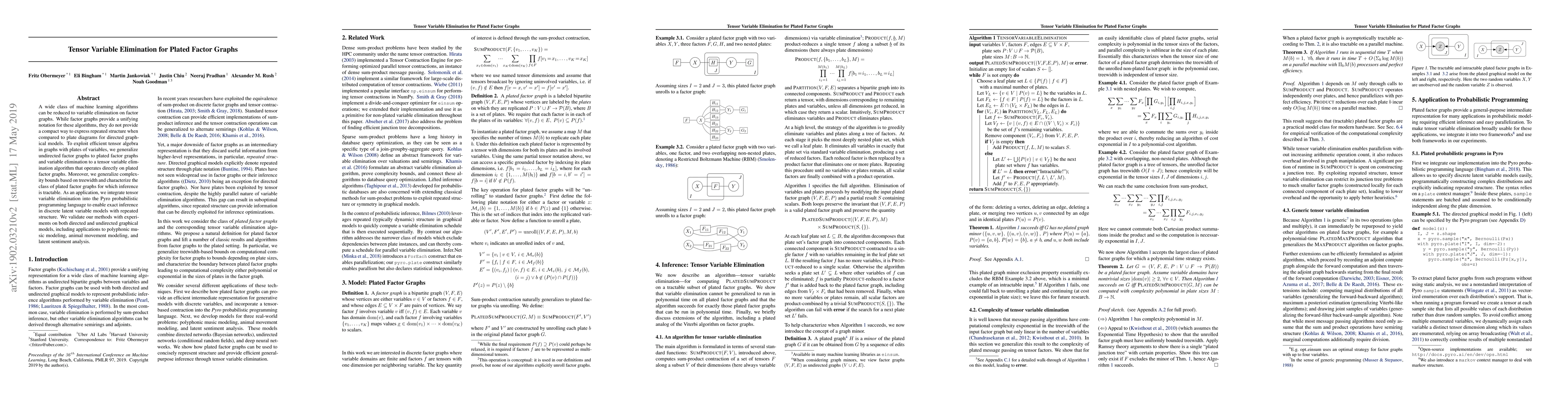 This paper proposes a tensor variable elimination method for plated factor graphs, extending traditional factor graphs to efficiently handle repeated structures. The authors demonstrate its application in the Pyro probabilistic programming language for exact inference in models with repeated latent variables, validated through experiments on various applications.