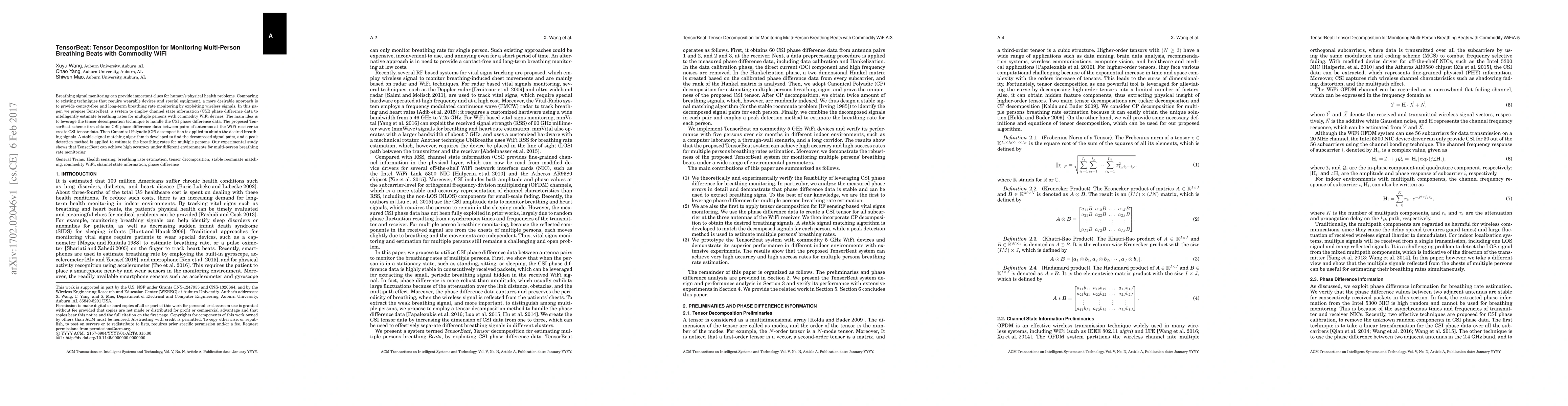 TensorBeat utilizes tensor decomposition on channel state information (CSI) phase difference data from commodity WiFi to non-invasively monitor breathing rates for multiple individuals. The system employs Canonical Polyadic decomposition to extract breathing signals and achieves high accuracy across various environments.
