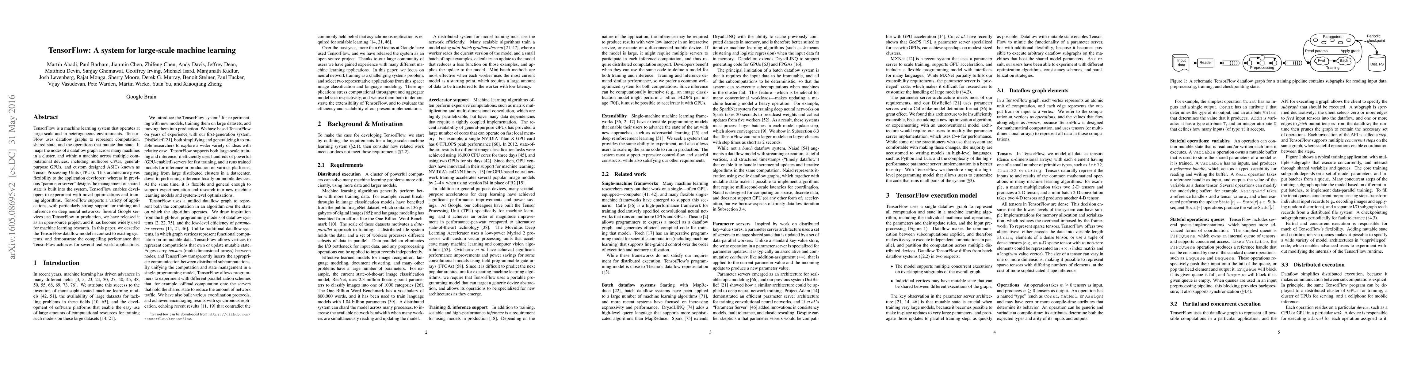 TensorFlow is a machine learning system that operates at large scale and in heterogeneous environments. TensorFlow uses dataflow graphs to represent computation, shared state, and the operations that mutate that state. It maps the nodes of a dataflow graph across many machines in a cluster, and within a machine across multiple computational devices, including multicore CPUs, general-purpose GPUs, and custom designed ASICs known as Tensor Processing Units (TPUs). This architecture gives flexibility to the application developer: whereas in previous "parameter server" designs the management of shared state is built into the system, TensorFlow enables developers to experiment with novel optimizations and training algorithms. TensorFlow supports a variety of applications, with particularly strong support for training and inference on deep neural networks. Several Google services use TensorFlow in production, we have released it as an open-source project, and it has become widely used for machine learning research. In this paper, we describe the TensorFlow dataflow model in contrast to existing systems, and demonstrate the compelling performance that TensorFlow achieves for several real-world applications.