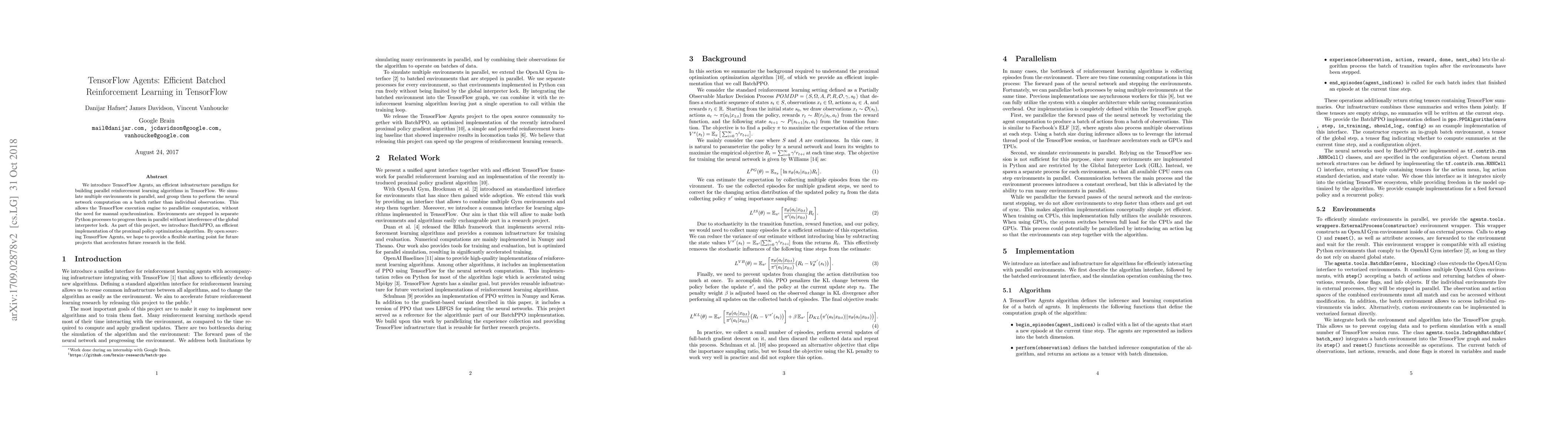 TensorFlow Agents offers an efficient infrastructure for parallel reinforcement learning in TensorFlow, enabling batch processing and neural network computations without manual synchronization. It introduces BatchPPO, an optimized proximal policy optimization algorithm, aiming to accelerate future research in reinforcement learning.