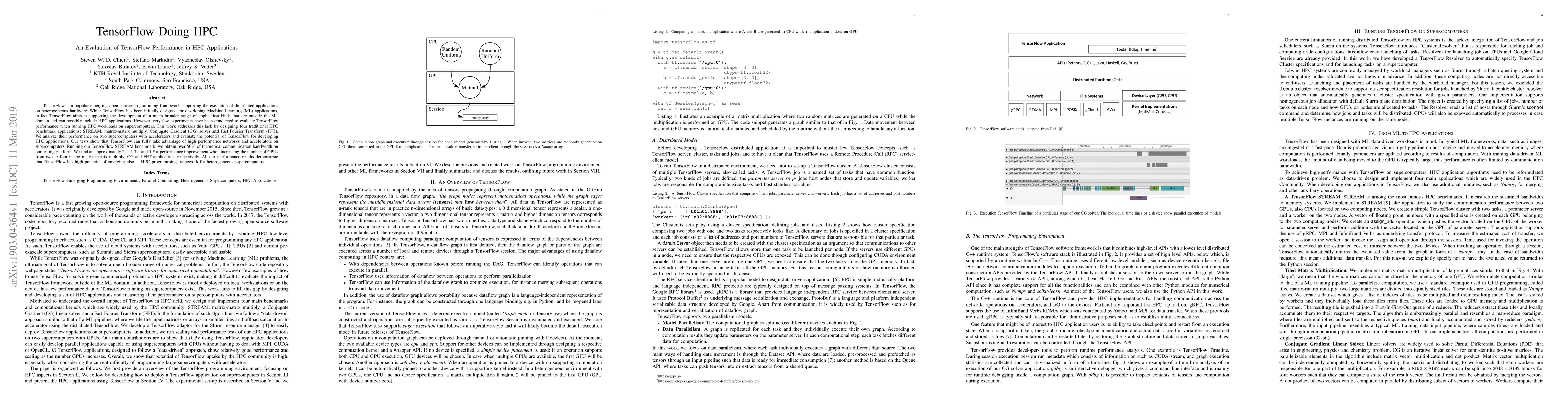 This paper evaluates TensorFlow's performance for High-Performance Computing (HPC) applications on supercomputers using four traditional benchmarks. Results show TensorFlow can leverage high-speed networks and accelerators effectively, achieving over 50% of theoretical communication bandwidth and significant performance improvements with increased GPU usage.