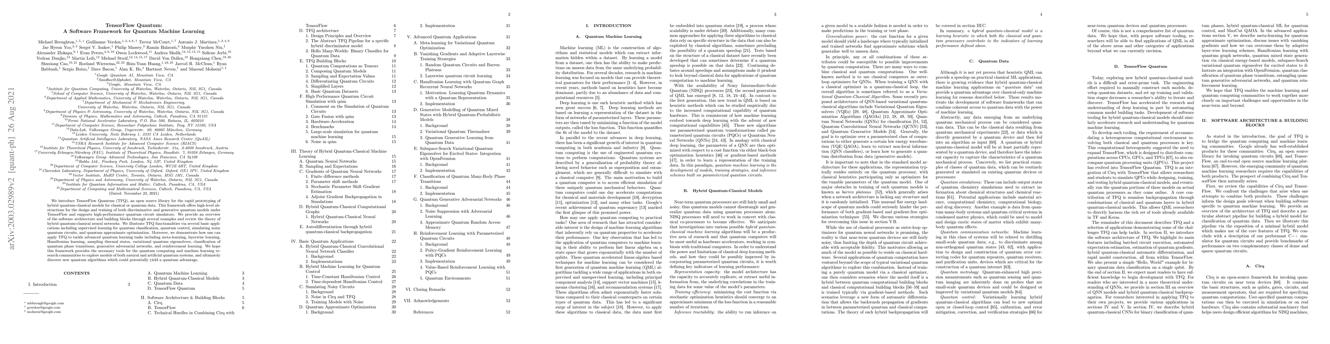 TensorFlow Quantum (TFQ) is an open-source library for developing hybrid quantum-classical machine learning models, offering high-level abstractions and high-performance simulators. It facilitates advanced quantum learning tasks, from basic applications like quantum classification to complex ones like meta-learning and reinforcement learning, aiming to enable quantum computing and machine learning research.