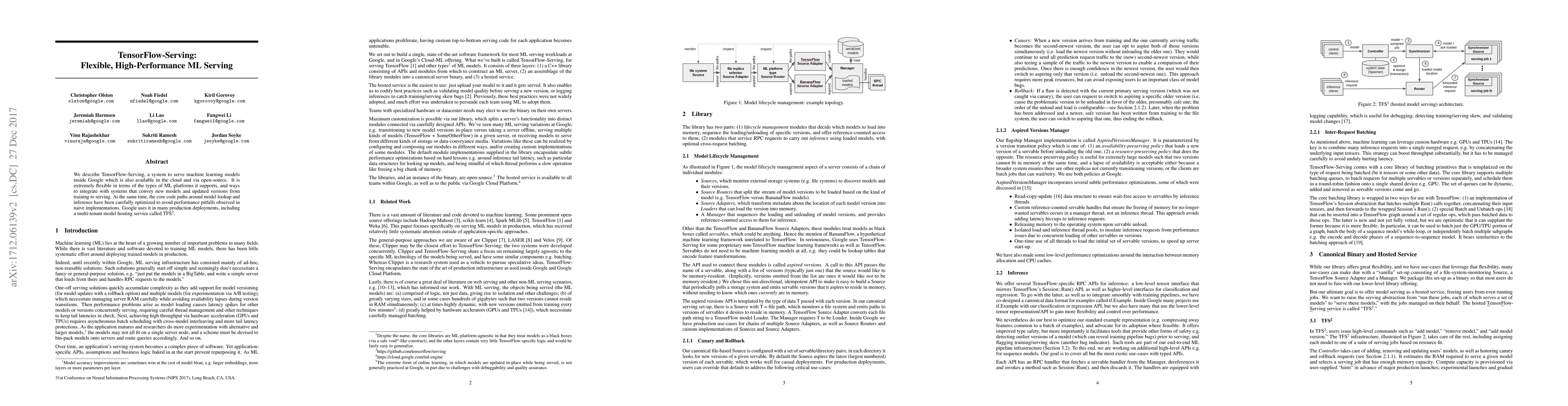 TensorFlow-Serving is a flexible ML serving system that optimizes performance for multi-tenant model hosting services, supporting various ML platforms and integrating with systems to update models quickly.