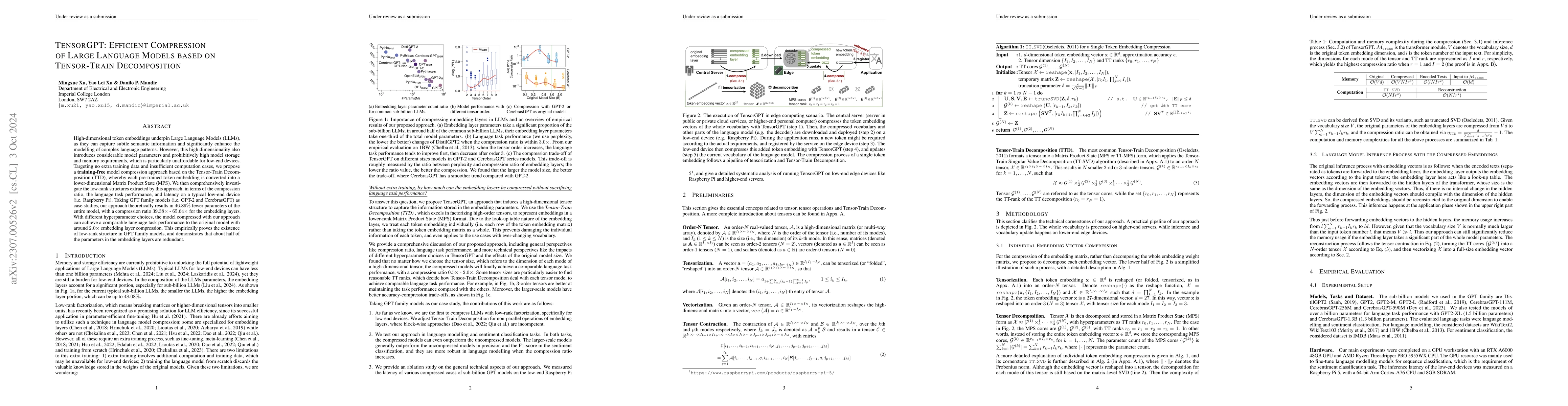 This paper proposes a Tensor-Train Decomposition (TTD) method to compress the embedding layer in Large Language Models (LLMs) by treating token embeddings as Matrix Product States (MPS). The approach achieves up to 38.40 times compression with TTD, and even at a 3.31 times compression factor, outperforms the original GPT-2 model in performance.