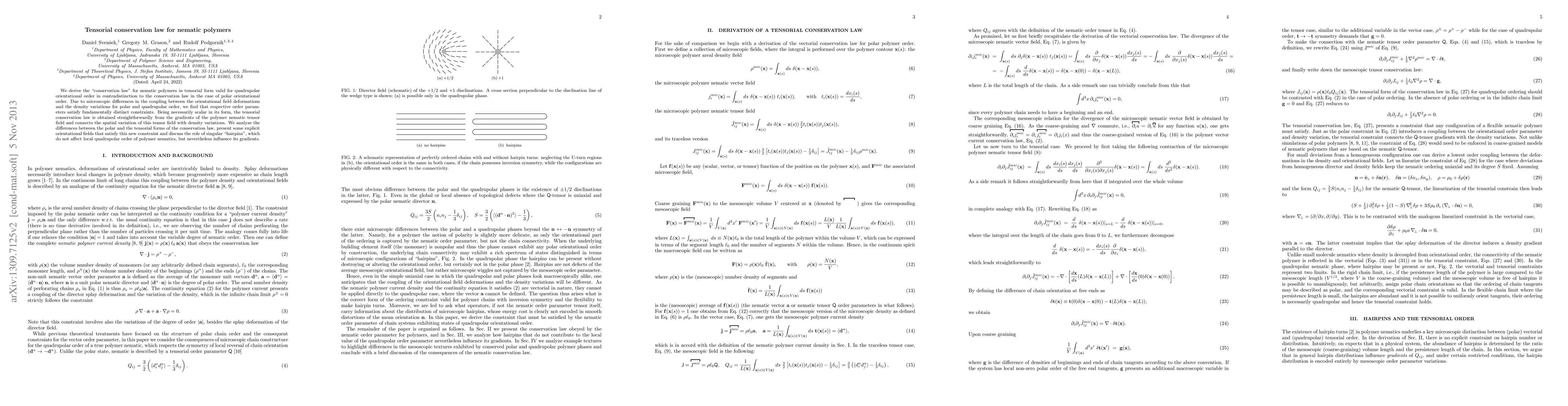 We derive the "conservation law" for nematic polymers in tensorial form valid for quadrupolar orientational order in contradistinction to the conservation law in the case of polar orientational order. Due to microscopic differences in the coupling between the orientational field deformations and the density variations for polar and quadrupolar order, we find that respective order parameters satisfy fundamentally distinct constraints. Being necessarily scalar in its form, the tensorial conservation law is obtained straightforwardly from the gradients of the polymer nematic tensor field and connects the spatial variation of this tensor field with density variations. We analyze the differences between the polar and the tensorial forms of the conservation law, present some explicit orientational fields that satisfy this new constraint and discuss the role of singular "hairpins", which do not affect local quadrupolar order of polymer nematics, but nevertheless influence its gradients.