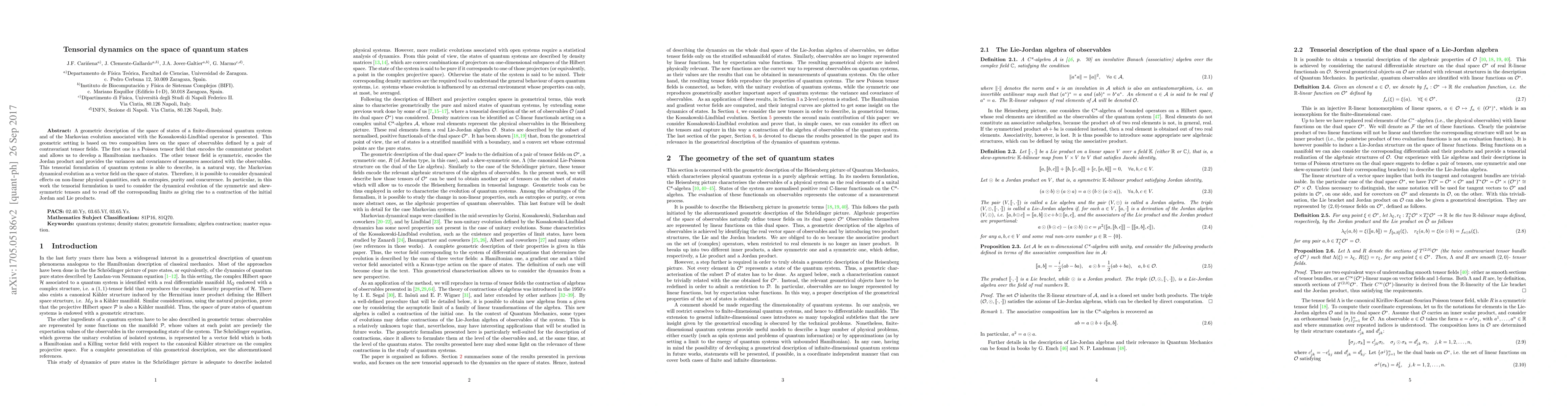 A geometric description of the space of states of a finite-dimensional quantum system and of the Markovian evolution associated with the Kossakowski-Lindblad operator is presented. This geometric setting is based on two composition laws on the space of observables defined by a pair of contravariant tensor fields. The first one is a Poisson tensor field that encodes the commutator product and allows us to develop a Hamiltonian mechanics. The other tensor field is symmetric, encodes the Jordan product and provides the variances and covariances of measures associated with the observables. This tensorial formulation of quantum systems is able to describe, in a natural way, the Markovian dynamical evolution as a vector field on the space of states. Therefore, it is possible to consider dynamical effects on non-linear physical quantities, such as entropies, purity and concurrence. In particular, in this work the tensorial formulation is used to consider the dynamical evolution of the symmetric and skew-symmetric tensors and to read off the corresponding limits as giving rise to a contraction of the initial Jordan and Lie products.
