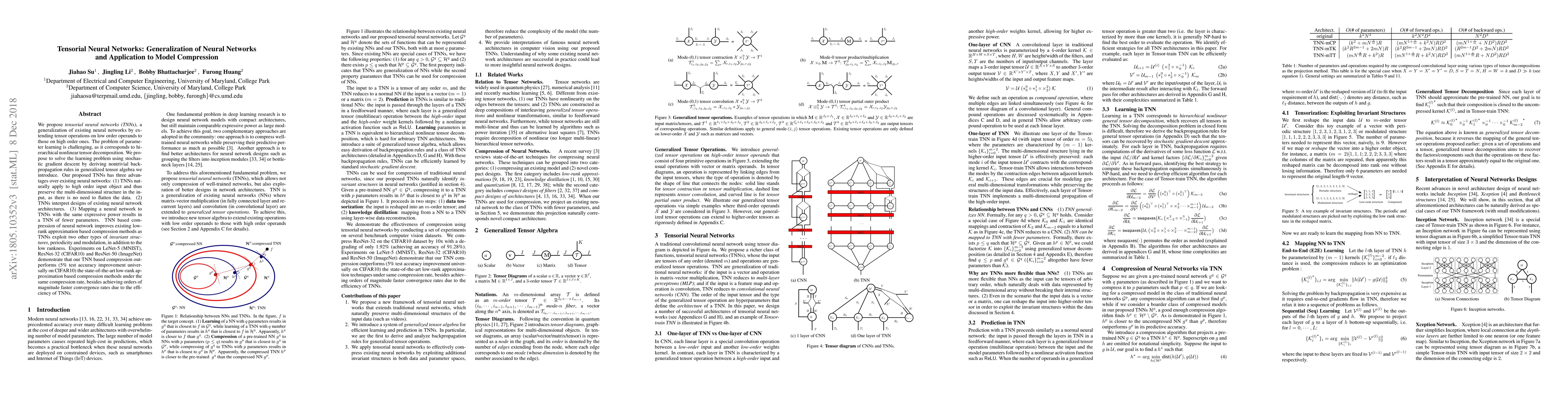 We propose tensorial neural networks (TNNs), a generalization of existing neural networks by extending tensor operations on low order operands to those on high order ones. The problem of parameter learning is challenging, as it corresponds to hierarchical nonlinear tensor decomposition. We propose to solve the learning problem using stochastic gradient descent by deriving nontrivial backpropagation rules in generalized tensor algebra we introduce. Our proposed TNNs has three advantages over existing neural networks: (1) TNNs naturally apply to high order input object and thus preserve the multi-dimensional structure in the input, as there is no need to flatten the data. (2) TNNs interpret designs of existing neural network architectures. (3) Mapping a neural network to TNNs with the same expressive power results in a TNN of fewer parameters. TNN based compression of neural network improves existing low-rank approximation based compression methods as TNNs exploit two other types of invariant structures, periodicity and modulation, in addition to the low rankness. Experiments on LeNet-5 (MNIST), ResNet-32 (CIFAR10) and ResNet-50 (ImageNet) demonstrate that our TNN based compression outperforms (5% test accuracy improvement universally on CIFAR10) the state-of-the-art low-rank approximation based compression methods under the same compression rate, besides achieving orders of magnitude faster convergence rates due to the efficiency of TNNs.