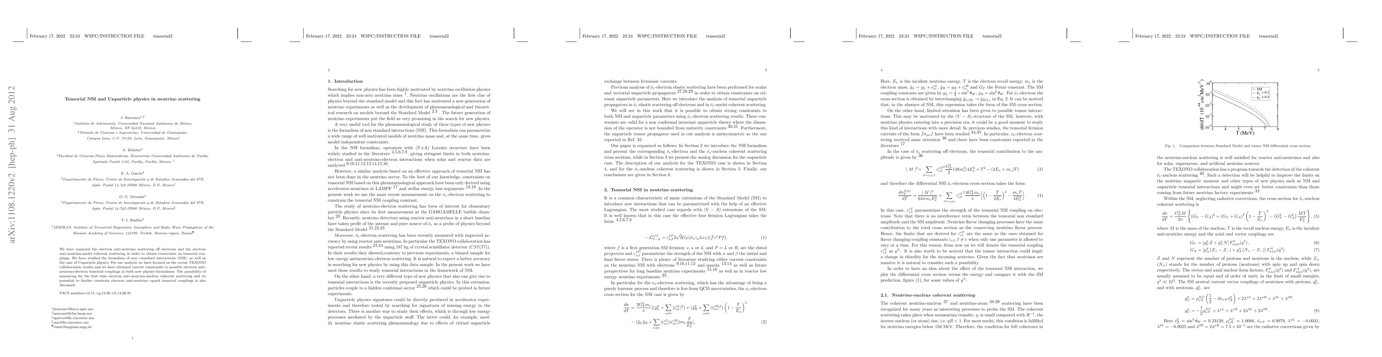 This paper analyzes electron anti-neutrino scattering to constrain tensorial couplings in non-standard interactions and Unparticle physics, using TEXONO results. It discusses the potential of measuring electron anti-neutrino-nucleus coherent scattering to further constrain these couplings.