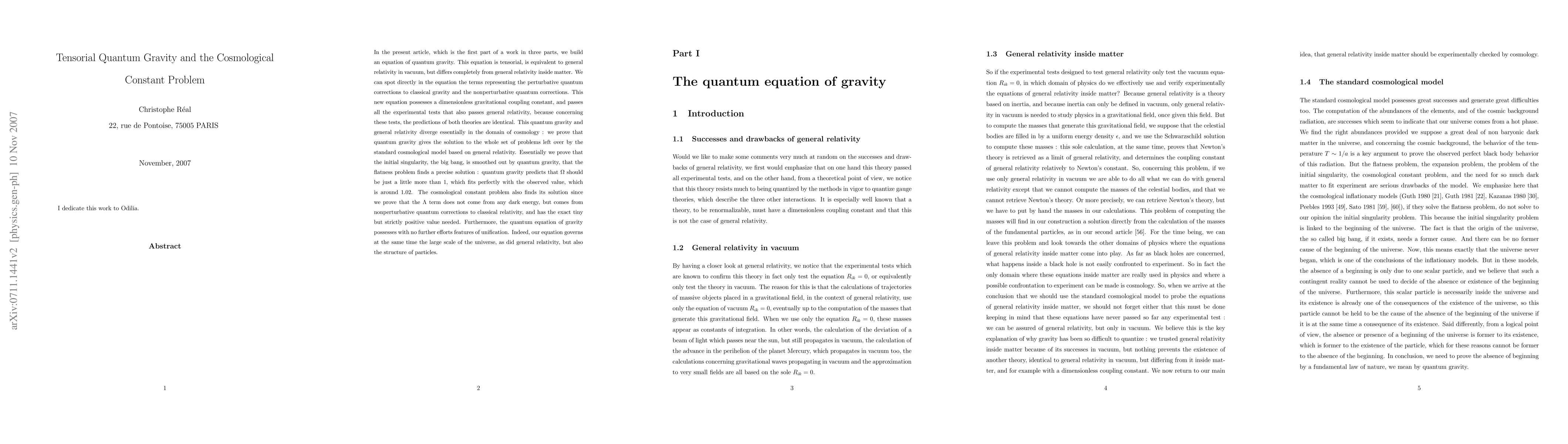 In the present article, which is the first part of a work in three parts, we build an equation of quantum gravity. This equation is tensorial, is equivalent to general relativity in vacuum, but differs completely from general relativity inside matter. This new equation possesses a dimensionless gravitational coupling constant, and passes all experimental tests that also passes general relativity. This quantum gravity and general relativity diverge essentially in the domain of cosmology : we prove that quantum gravity gives the solution to the whole set of problems left over by the standard cosmological model based on general relativity. Essentially, we prove that the initial singularity, the big bang, is smoothed out by quantum gravity, that the flatness problem finds a precise solution : quantum gravity predicts that Omega should be just a little greater than 1, which fits perfectly with the observed 1.02. The cosmological constant problem finds also its solution since we prove that the Lambda term does not come from any dark energy, but comes from nonperturbative quantum corrections to classical relativity, and has the exact tiny but strictly positive value needed. Furthermore, the quantum equation of gravity possesses, with no further efforts, features of unification. Indeed, our equation governs at the same time the large scale of the universe, as did general relativity, but also the structure of particles.
