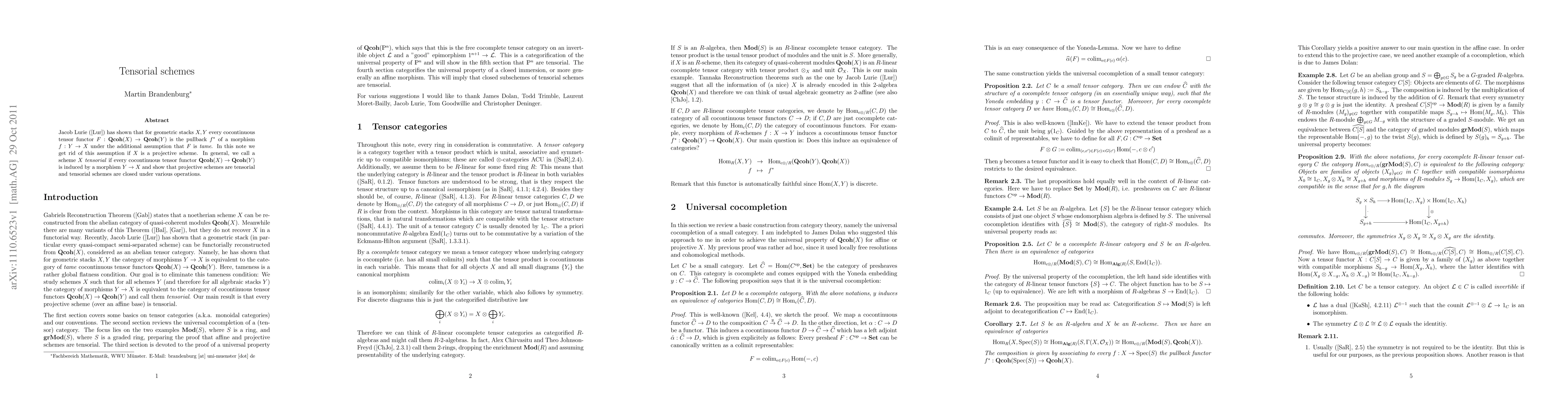 Jacob Lurie (arXiv:math/0412266) has shown that for geometric stacks X,Y every cocontinuous tensor functor F : Qcoh(X) -> Qcoh(Y) is the pullback of a morphism Y -> X under the additional assumption that F is tame. In this note we get rid of this assumption if X is a projective scheme. In general, we call a scheme X tensorial if every cocontinuous tensor functor Qcoh(X) -> Qcoh(Y) is induced by a unique morphism Y -> X, show that projective schemes are tensorial and tensorial schemes are closed under various operations.