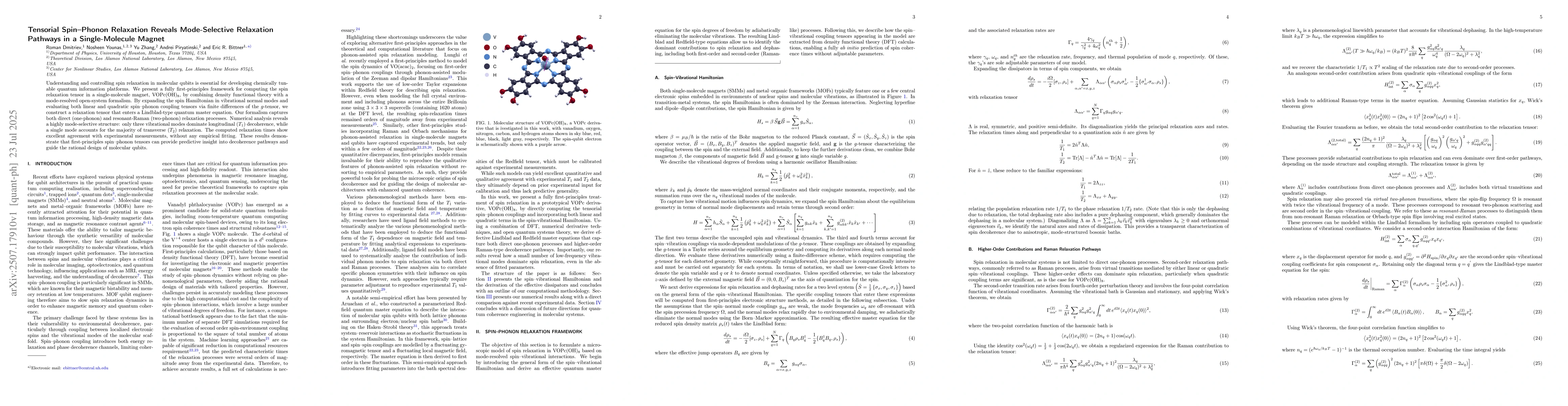 Understanding and controlling spin relaxation in molecular qubits is essential for developing chemically tunable quantum information platforms. We present a fully first-principles framework for computing the spin relaxation tensor in a single-molecule magnet, \ce{VOPc(OH)8}, by combining density functional theory with a mode-resolved open-system formalism. By expanding the spin Hamiltonian in vibrational normal modes and evaluating both linear and quadratic spin-phonon coupling tensors via finite differences of the $g$-tensor, we construct a relaxation tensor that enters a Lindblad-type quantum master equation. Our formalism captures both direct (one-phonon) and resonant-Raman (two-phonon) relaxation processes. Numerical analysis reveals a highly mode-selective structure: only three vibrational modes dominate longitudinal ($T_1$) decoherence, while a single mode accounts for the majority of transverse ($T_2$) relaxation. The computed relaxation times show excellent agreement with experimental measurements, without any empirical fitting. These results demonstrate that first-principles spin-phonon tensors can provide predictive insight into decoherence pathways and guide the rational design of molecular qubits.