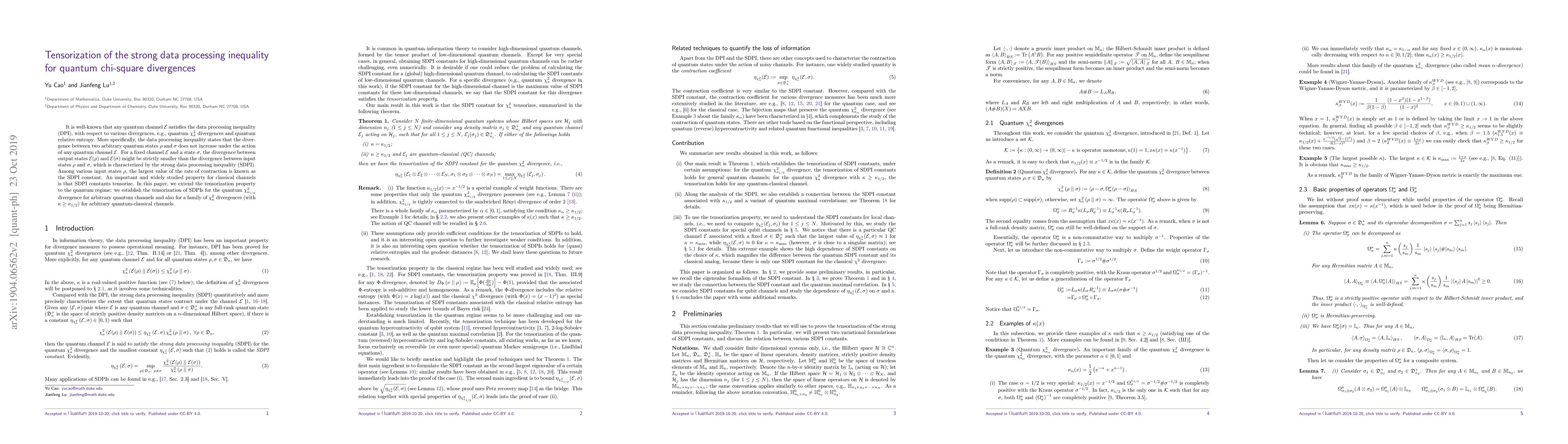 It is well-known that any quantum channel $\mathcal{E}$ satisfies the data processing inequality (DPI), with respect to various divergences, e.g., quantum $\chi^2_{\kappa}$divergences and quantum relative entropy. More specifically, the data processing inequality states that the divergence between two arbitrary quantum states $\rho$ and $\sigma$ does not increase under the action of any quantum channel $\mathcal{E}$. For a fixed channel $\mathcal{E}$ and a state $\sigma$, the divergence between output states $\mathcal{E}(\rho)$ and $\mathcal{E}(\sigma)$ might be strictly smaller than the divergence between input states $\rho$ and $\sigma$, which is characterized by the strong data processing inequality (SDPI). Among various input states $\rho$, the largest value of the rate of contraction is known as the SDPI constant. An important and widely studied property for classical channels is that SDPI constants tensorize. In this paper, we extend the tensorization property to the quantum regime: we establish the tensorization of SDPIs for the quantum $\chi^2_{\kappa_{1/2}}$ divergence for arbitrary quantum channels and also for a family of $\chi^2_{\kappa}$ divergences (with $\kappa \ge \kappa_{1/2}$) for arbitrary quantum-classical channels.