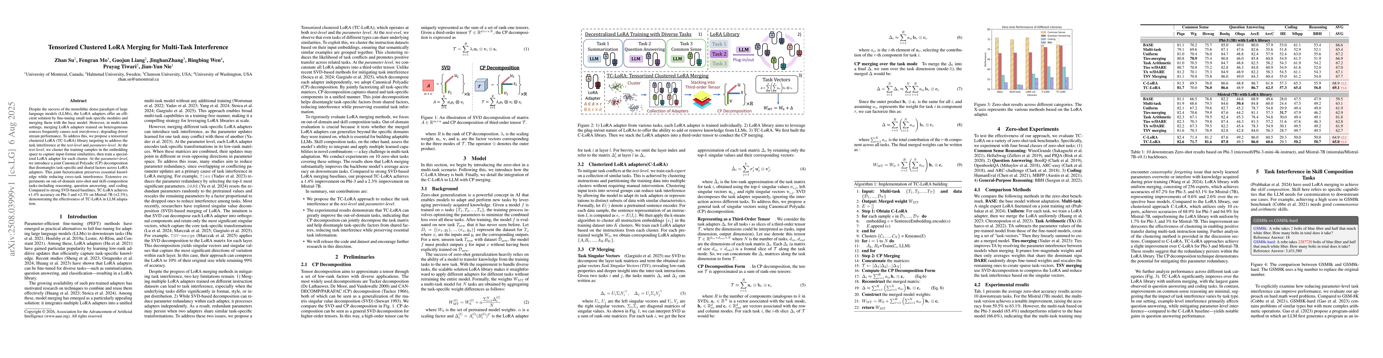 Despite the success of the monolithic dense paradigm of large language models (LLMs), the LoRA adapters offer an efficient solution by fine-tuning small task-specific modules and merging them with the base model. However, in multi-task settings, merging LoRA adapters trained on heterogeneous sources frequently causes \textit{task interference}, degrading downstream performance. To address this, we propose a tensorized clustered LoRA (TC-LoRA) library targeting to address the task interference at the \textit{text-level} and \textit{parameter-level}. At the \textit{text-level}, we cluster the training samples in the embedding space to capture input-format similarities, then train a specialized LoRA adapter for each cluster. At the \textit{parameter-level}, we introduce a joint Canonical Polyadic (CP) decomposition that disentangles task-specific and shared factors across LoRA adapters. This joint factorization preserves essential knowledge while reducing cross-task interference. Extensive experiments on out-of-domain zero-shot and skill-composition tasks-including reasoning, question answering, and coding. Compared to strong SVD-based baselines, TC-LoRA achieves +1.4\% accuracy on Phi-3 and +2.3\% on Mistral-7B (+2.3\%), demonstrating the effectiveness of TC-LoRA in LLM adaptation.