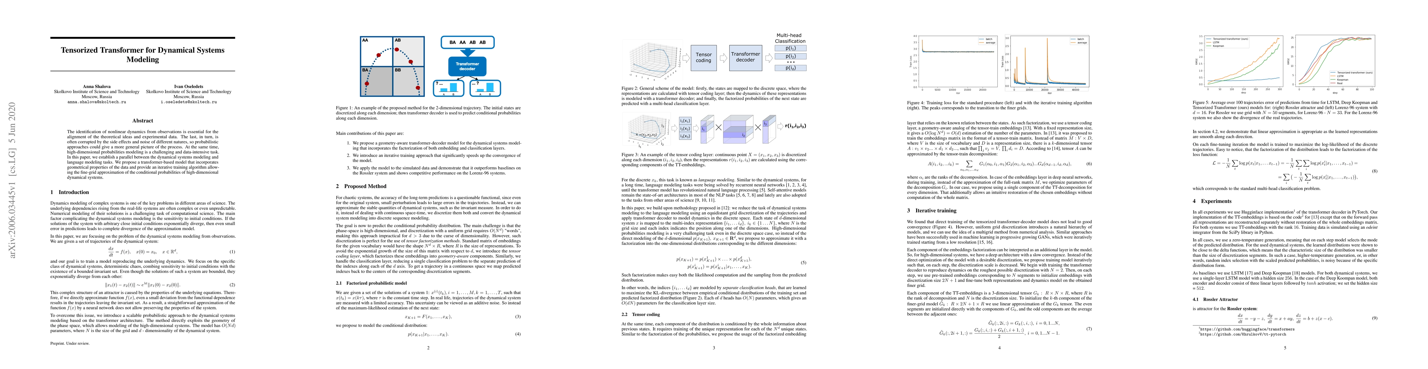 The identification of nonlinear dynamics from observations is essential for the alignment of the theoretical ideas and experimental data. The last, in turn, is often corrupted by the side effects and noise of different natures, so probabilistic approaches could give a more general picture of the process. At the same time, high-dimensional probabilities modeling is a challenging and data-intensive task. In this paper, we establish a parallel between the dynamical systems modeling and language modeling tasks. We propose a transformer-based model that incorporates geometrical properties of the data and provide an iterative training algorithm allowing the fine-grid approximation of the conditional probabilities of high-dimensional dynamical systems.