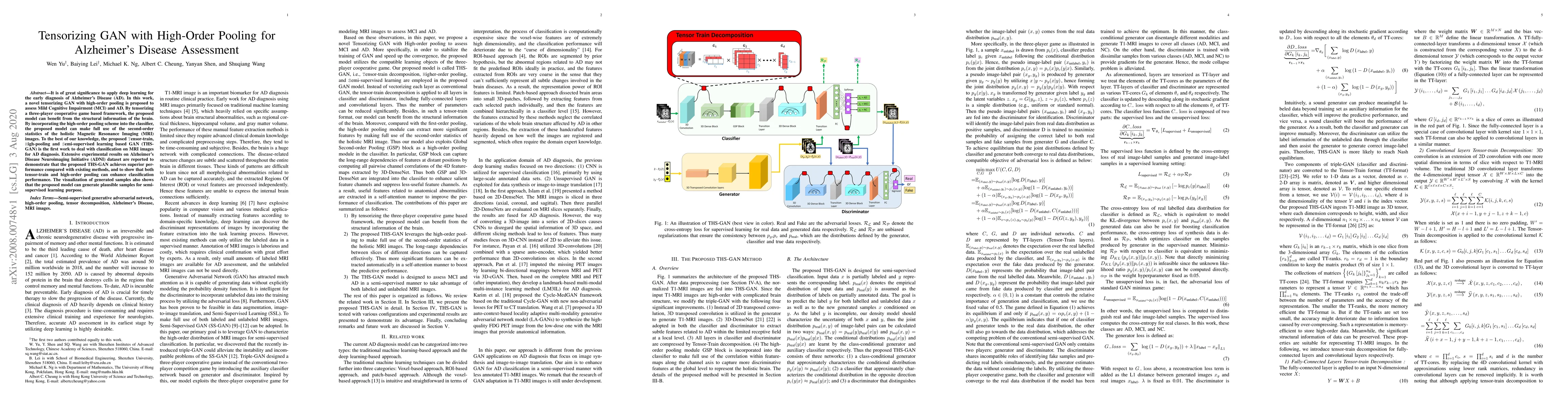 This paper proposes a novel Tensor-train, High-pooling, and Semi-supervised learning based GAN (THS-GAN) for early diagnosis of Alzheimer's Disease by assessing Mild Cognitive Impairment (MCI) and AD using MRI images. The model leverages tensorizing GAN with high-order pooling to utilize structural brain information and second-order statistics, achieving superior performance over existing methods on the ADNI dataset.