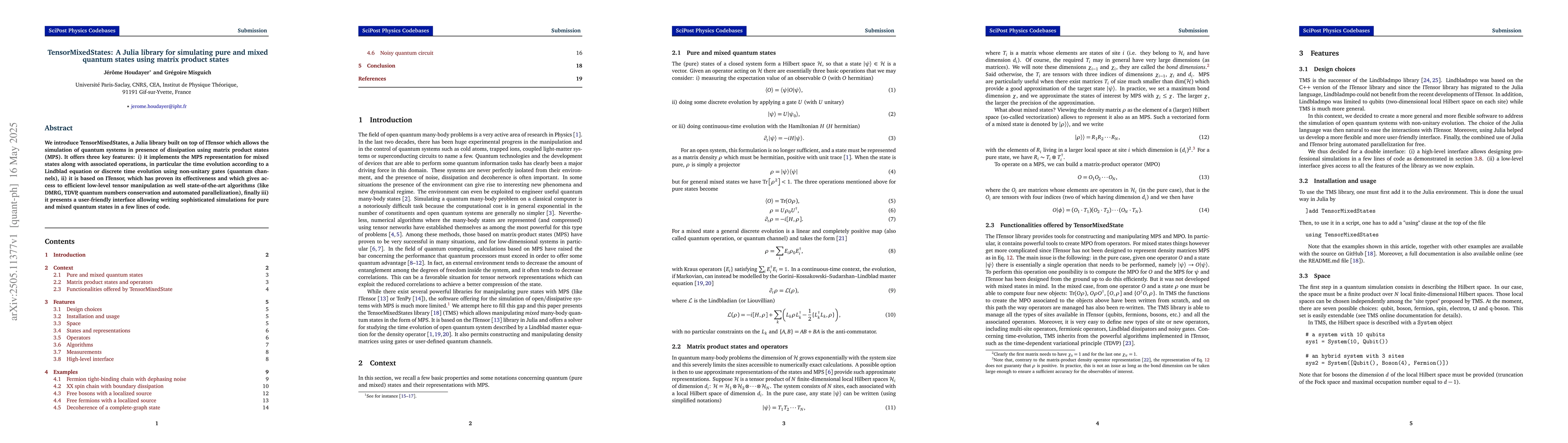 The paper introduces TensorMixedStates, a Julia library built on ITensor for simulating quantum systems with dissipation using matrix product states (MPS).
