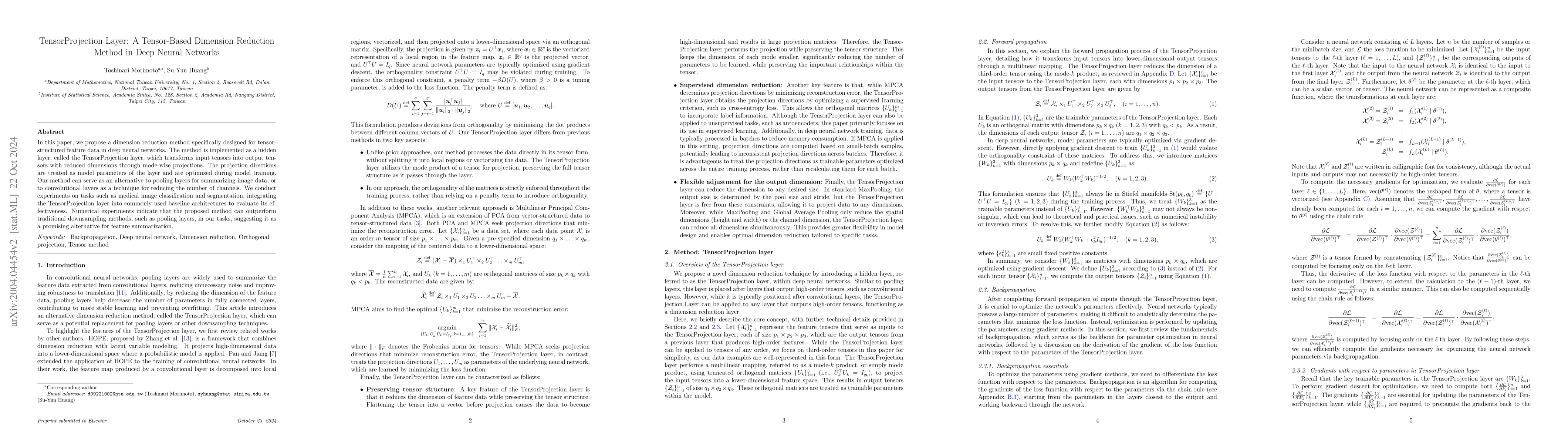 In this paper, we propose a dimensionality reduction method applied to tensor-structured data as a hidden layer (we call it TensorProjection Layer) in a convolutional neural network. Our proposed method transforms input tensors into ones with a smaller dimension by projection. The directions of projection are viewed as training parameters associated with our proposed layer and trained via a supervised learning criterion such as minimization of the cross-entropy loss function. We discuss the gradients of the loss function with respect to the parameters associated with our proposed layer. We also implement simple numerical experiments to evaluate the performance of the TensorProjection Layer.