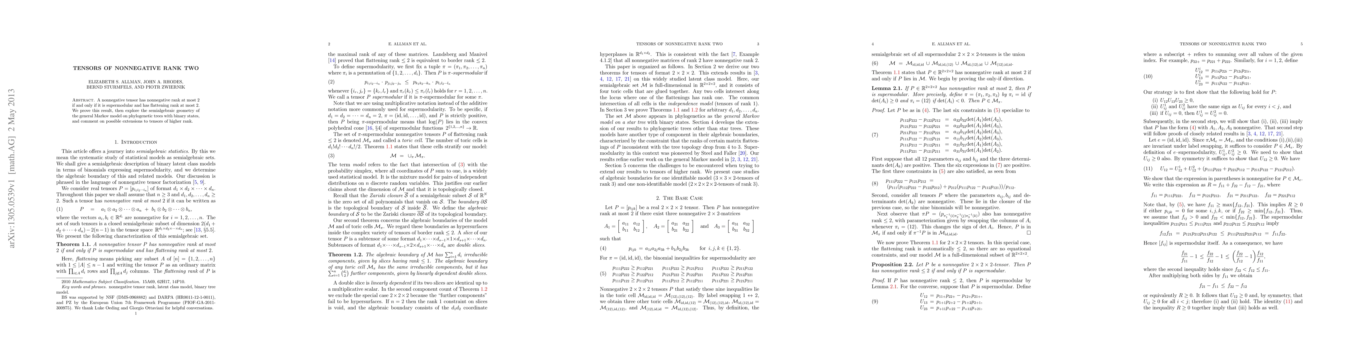 Summary: This paper proves that a nonnegative tensor has a nonnegative rank of at most 2 if it is supermodular and has a flattening rank of at most 2. It also examines the semialgebraic geometry of Markov models on phylogenetic trees with binary states and discusses potential extensions to higher-rank tensors.