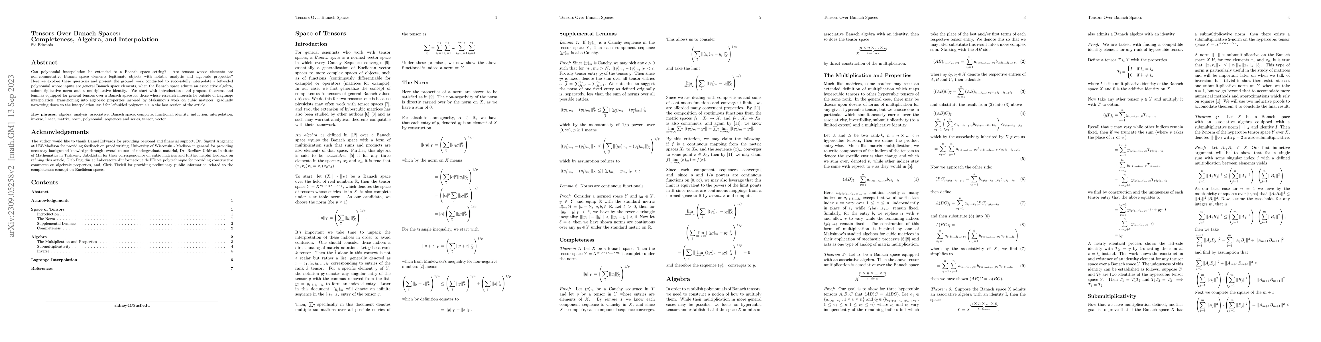 Can polynomial interpolation be extended to a Banach space setting? Are tensors whose elements are non-commutative Banach space elements legitimate objects with notable analytic and algebraic properties? Here we explore these questions and present the ground work conducted to successfully interpolate a left-sided polynomial whose inputs are general Banach space elements, when the Banach space admits an associative algebra, submultiplicative norm and a multiplicative identity. We start with introductions and propose theorems and lemmas equipped for general tensors over a Banach space for those whose research interests lie outside of Lagrange interpolation, transitioning into algebraic properties inspired by Maksimov's work on cubic matrices, gradually narrowing down to the interpolation itself for left-sided polynomials in the last section of the article.