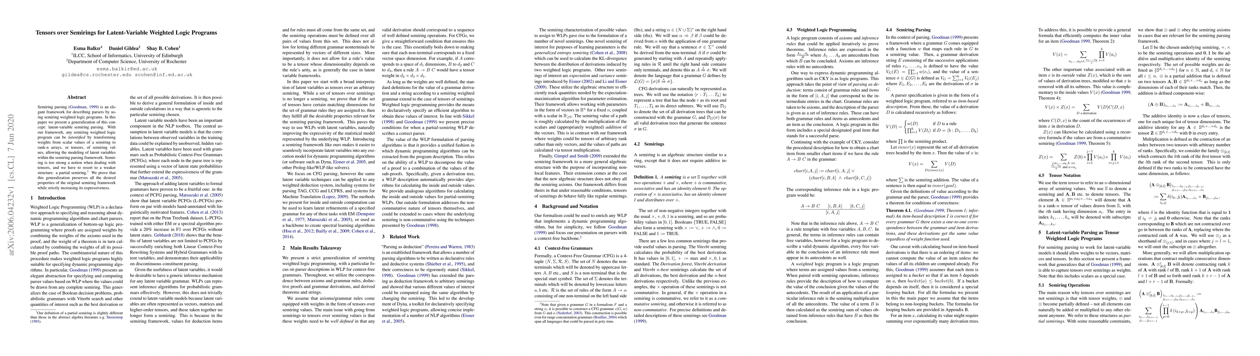 Semiring parsing is an elegant framework for describing parsers by using semiring weighted logic programs. In this paper we present a generalization of this concept: latent-variable semiring parsing. With our framework, any semiring weighted logic program can be latentified by transforming weights from scalar values of a semiring to rank-n arrays, or tensors, of semiring values, allowing the modelling of latent variables within the semiring parsing framework. Semiring is too strong a notion when dealing with tensors, and we have to resort to a weaker structure: a partial semiring. We prove that this generalization preserves all the desired properties of the original semiring framework while strictly increasing its expressiveness.
