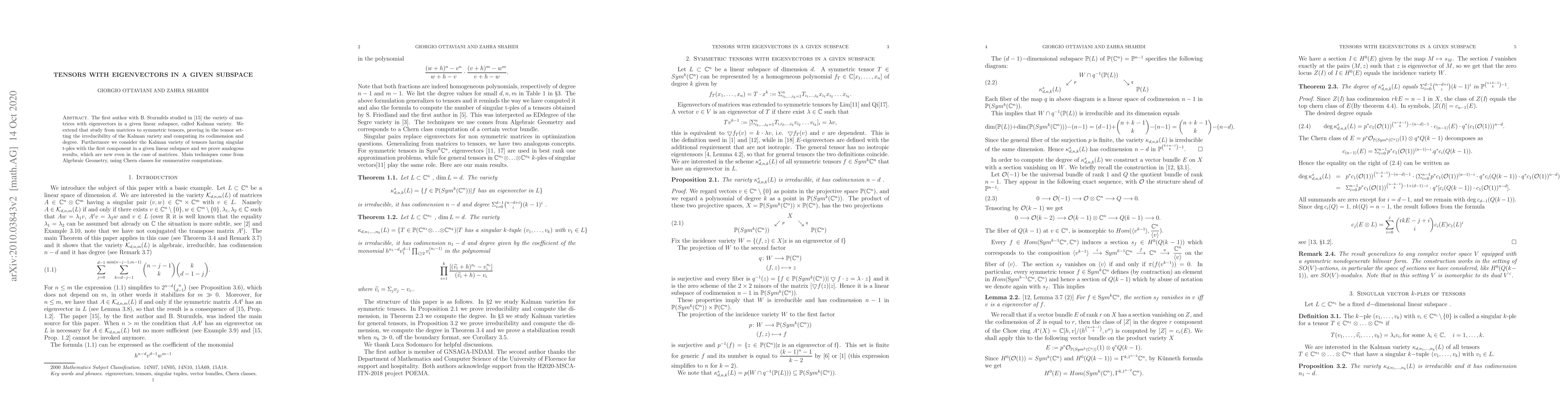The first author with B. Sturmfels studied the variety of matrices with eigenvectors in a given linear subspace, called Kalman variety. We extend that study from matrices to symmetric tensors, proving in the tensor setting the irreducibility of the Kalman variety and computing its codimension and degree. Furthermore we consider the Kalman variety of tensors having singular t-ples with the first component in a given linear subspace and we prove analogous results, which are new even in the case of matrices. Main techniques come from Algebraic Geometry, using Chern classes for enumerative computations.