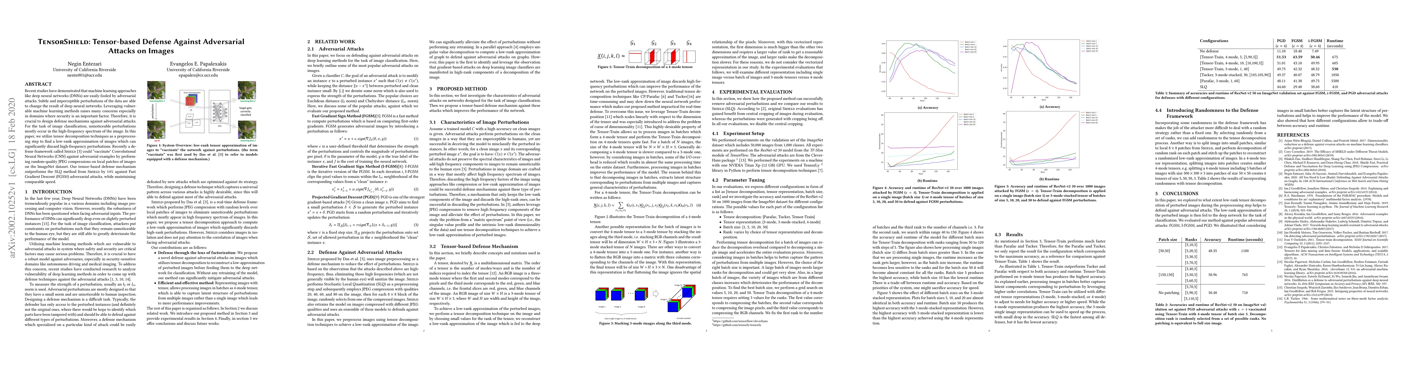 Title: TensorShield: Tensor-based Defense Against Adversarial Attacks on Images Summary: This paper proposes TensorShield, a tensor decomposition-based defense mechanism that effectively reduces high-frequency adversarial perturbations in images, outperforming existing methods like Shield by 14% against FastGradient Descent attacks while maintaining similar speed.