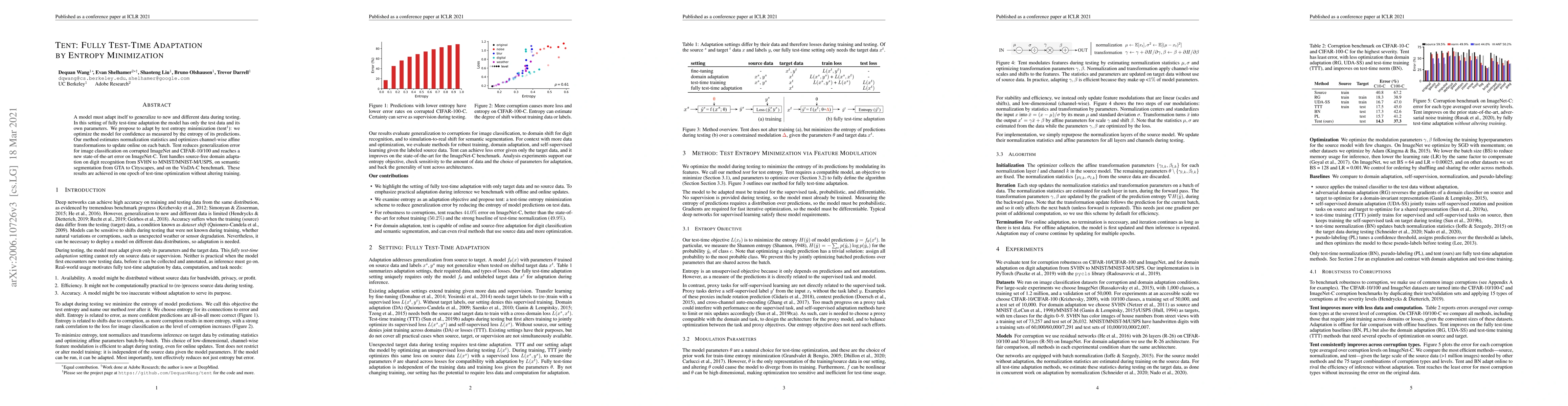 Tent proposes a fully test-time adaptation method by minimizing test entropy to enhance model confidence, achieving state-of-the-art results in various domain adaptation tasks without requiring any training data.