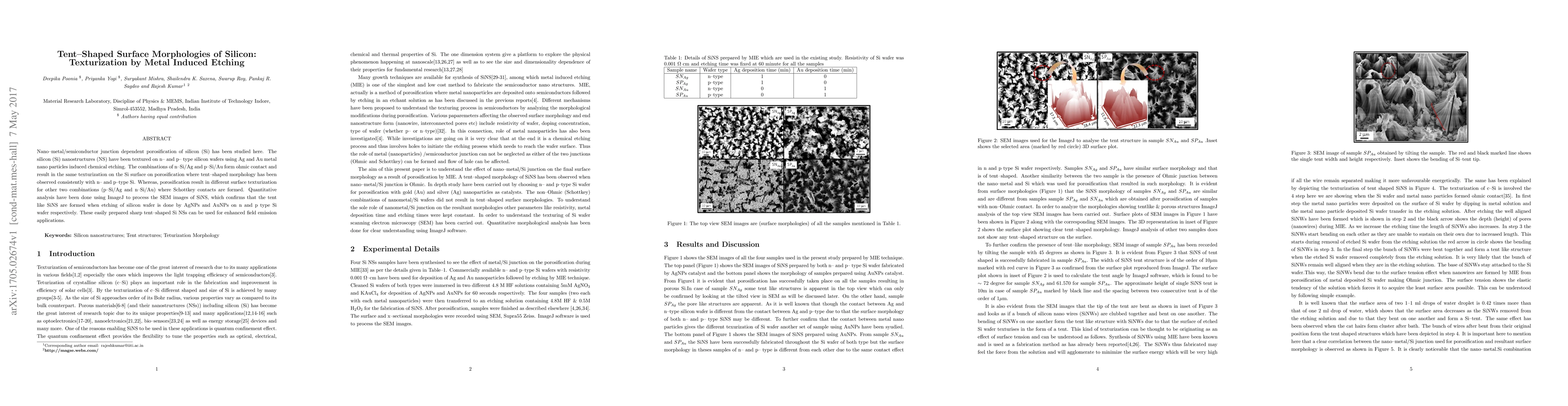 This paper investigates the formation of tent-shaped silicon nanostructures via metal-induced etching using Ag and Au nanoparticles on n- and p-type silicon wafers, revealing distinct texturization based on metal-semiconductor junction type. The study confirms the potential for these nanostructures in field emission applications.