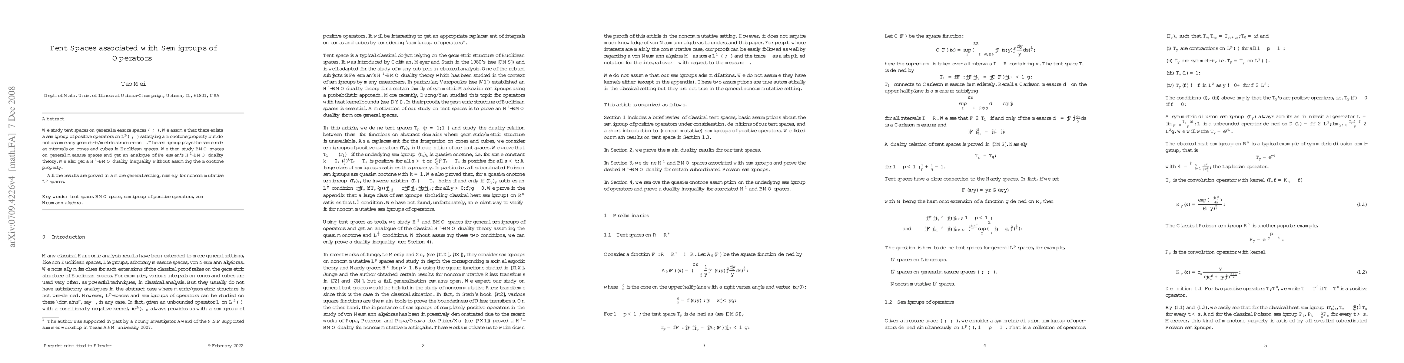 We study tent spaces on general measure spaces $(\Omega, \mu)$. We assume that there exists a semigroup of positive operators on $L^p(\Omega, \mu)$ satisfying a monotone property but do not assume any geometric/metric structure on $\Omega$. The semigroup plays the same role as integrals on cones and cubes in Euclidean spaces. We then study BMO spaces on general measure spaces and get an analogue of Fefferman's $H^1$-BMO duality theory. We also get a $H^1$-BMO duality inequality without assuming the monotone property. All the results are proved in a more general setting, namely for noncommutative $L^p$ spaces.