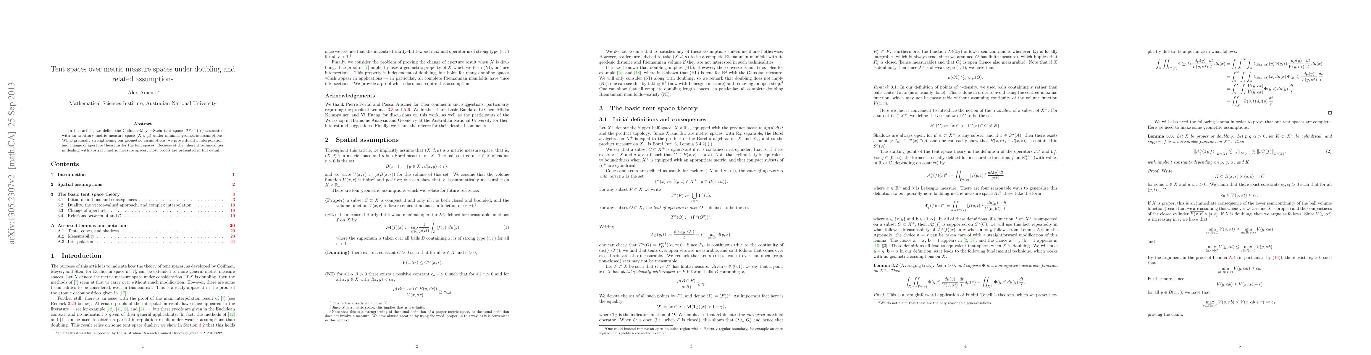 This paper defines Coifman-Meyer-Stein tent spaces $T^{p,q,\alpha}(X)$ over metric measure spaces under minimal geometric assumptions and proves duality, interpolation, and change of aperture theorems by gradually strengthening these assumptions. Detailed proofs are provided due to the complexities involved.