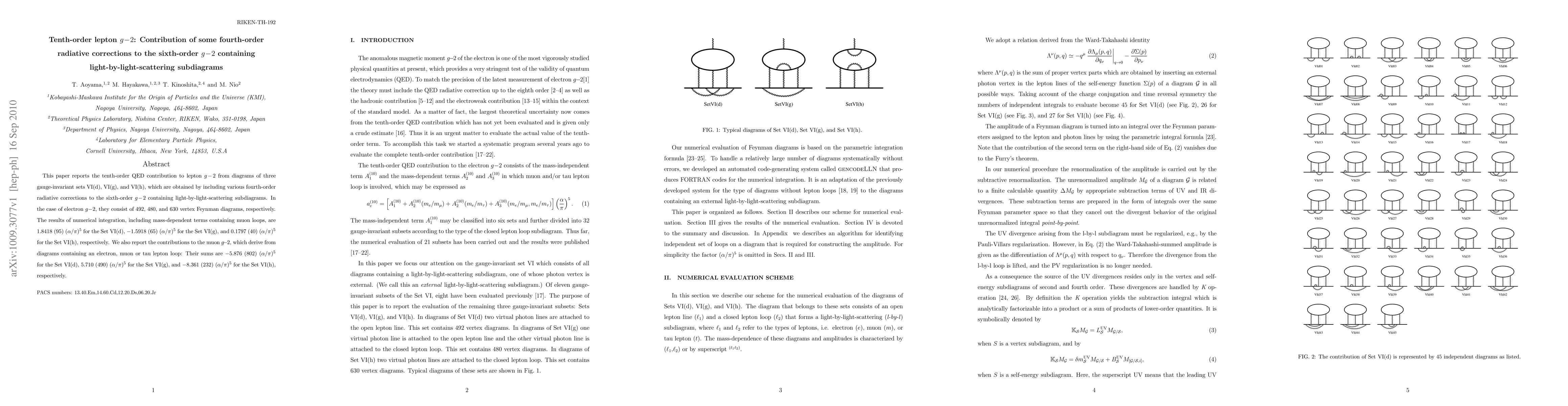 This paper reports the tenth-order QED contribution to lepton g-2 from diagrams of three gauge-invariant sets VI(d), VI(g), and VI(h), which are obtained by including various fourth-order radiative corrections to the sixth-order g-2 containing light-by-light-scattering subdiagrams. In the case of electron g-2, they consist of 492, 480, and 630 vertex Feynman diagrams, respectively. The results of numerical integration, including mass-dependent terms containing muon loops, are 1.8418(95) (alpha/pi)^5 for the Set VI(d), -1.5918(65) (alpha/pi)^5 for the Set VI(g), and 0.1797(40) (alpha/pi)^5 for the Set VI(h), respectively. We also report the contributions to the muon g-2, which derive from diagrams containing an electron, muon or tau lepton loop: Their sums are -5.876(802) (alpha/pi)^5 for the Set VI(d), 5.710(490) (alpha/pi)^5 for the Set VI(g), and -8.361(232) (alpha/pi)^5 for the Set VI(h), respectively.